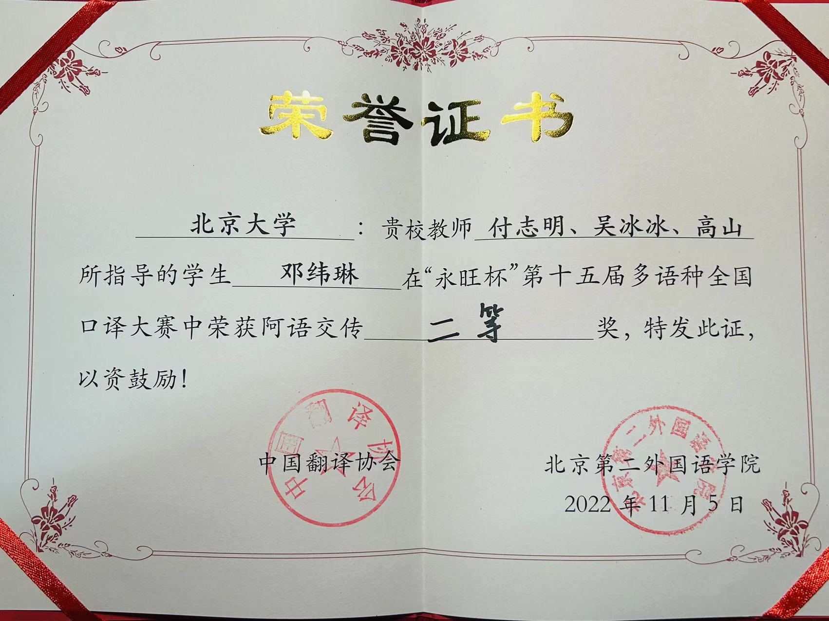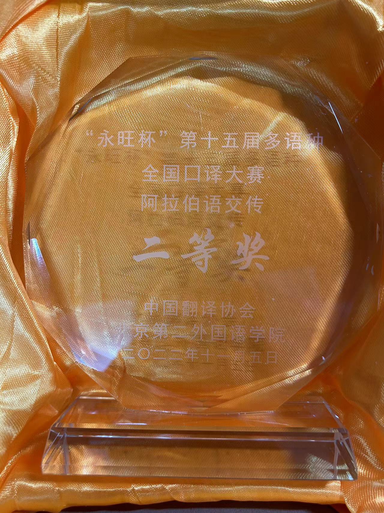 经过激烈角逐,财神在线官网阿拉伯语系2020级硕士生邓纬琳荣获阿语交传二等奖。
