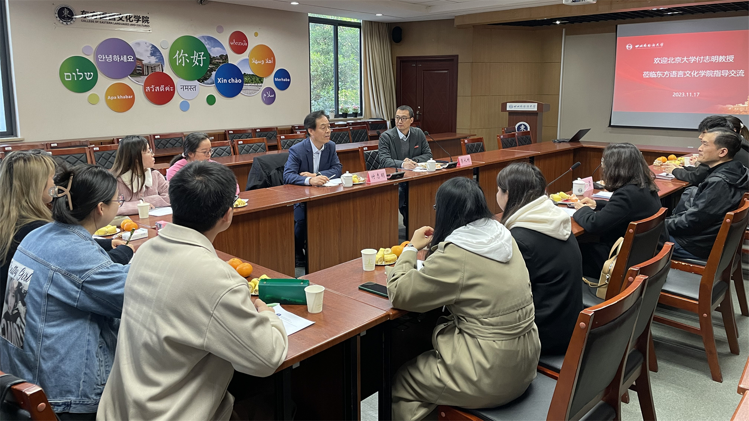 会后,付志明副院长应邀前往川外东方语言文化学院与师生交流座谈。付志明副院长认真倾听了学生在专业学习、技能提升、实习就业等方面所遇到的困惑与难题,用同学们身边感触最深的实例,幽默风趣地对大家提出的问题进行了解答,交流会现场气氛热烈融洽。