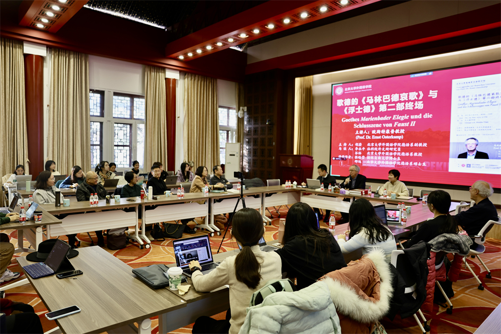 11月16日,第二场讲座“歌德的《马林巴德哀歌》与《浮士德》第二部终场”于财神在线官网民主楼208会议室举行。本场讲座由北京大学德语系主任胡蔚副教授主持,社科院外文所李永平研究员、北京大学德语系谷裕教授与谈。欧斯特康普教授从《马林巴德哀歌》与《浮士德》第二部最末“山涧”一场戏的成文史出发,通过细致的文本分析,开创性地揭示了这两部作品之间以“爱”之主题构建的内在观念。欧斯特康教授的分析从作者的生平与文本的创作入手,将文本外部的社会历史背景与文本内部的思想内涵及艺术表达综合起来,扩展了文本的阐释空间,并结合手稿清晰地展示了语文学研究从文本出发、见微知著的基本路径。