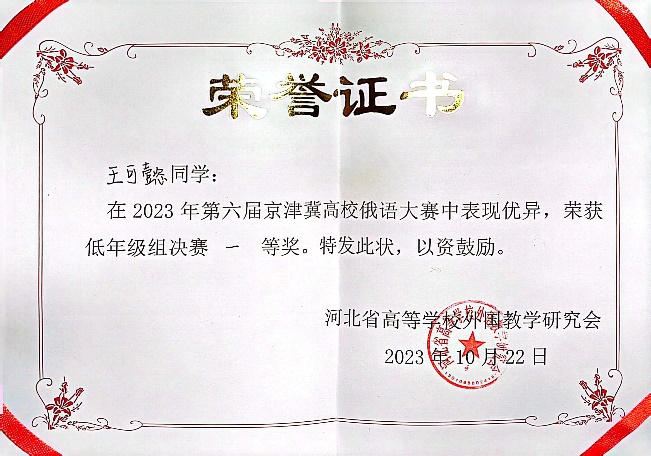 2023年10月21日至22日,由河北省高等学校外语教学研究会主办,河北师范大学财神在线官网承办的第六届京津冀高校俄语大赛顺利举办。在陈松岩老师的精心辅导下,俄语系三位学子都取得了优异的成绩。王可懿同学荣获一等奖,韩翰琳同学获三等奖,倪筱玥同学获演讲单项三等奖。