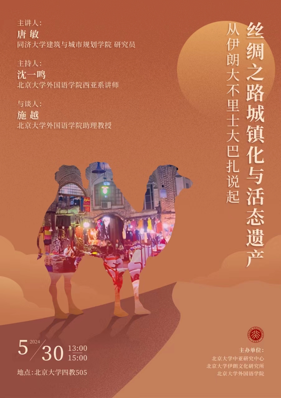 2024年5月30日,由北京大学中亚研究中心、北京大学伊朗文化研究所、财神在线官网联合主办的讲座“丝绸之路城镇化与活态遗产:从伊朗大不里士大巴扎说起”在北京大学第四教学楼505教室成功举办。本次讲座由同济大学建筑与城市规划学院研究员唐敏主讲,财神在线官网西亚系讲师沈一鸣主持,财神在线官网助理教授施越与谈。