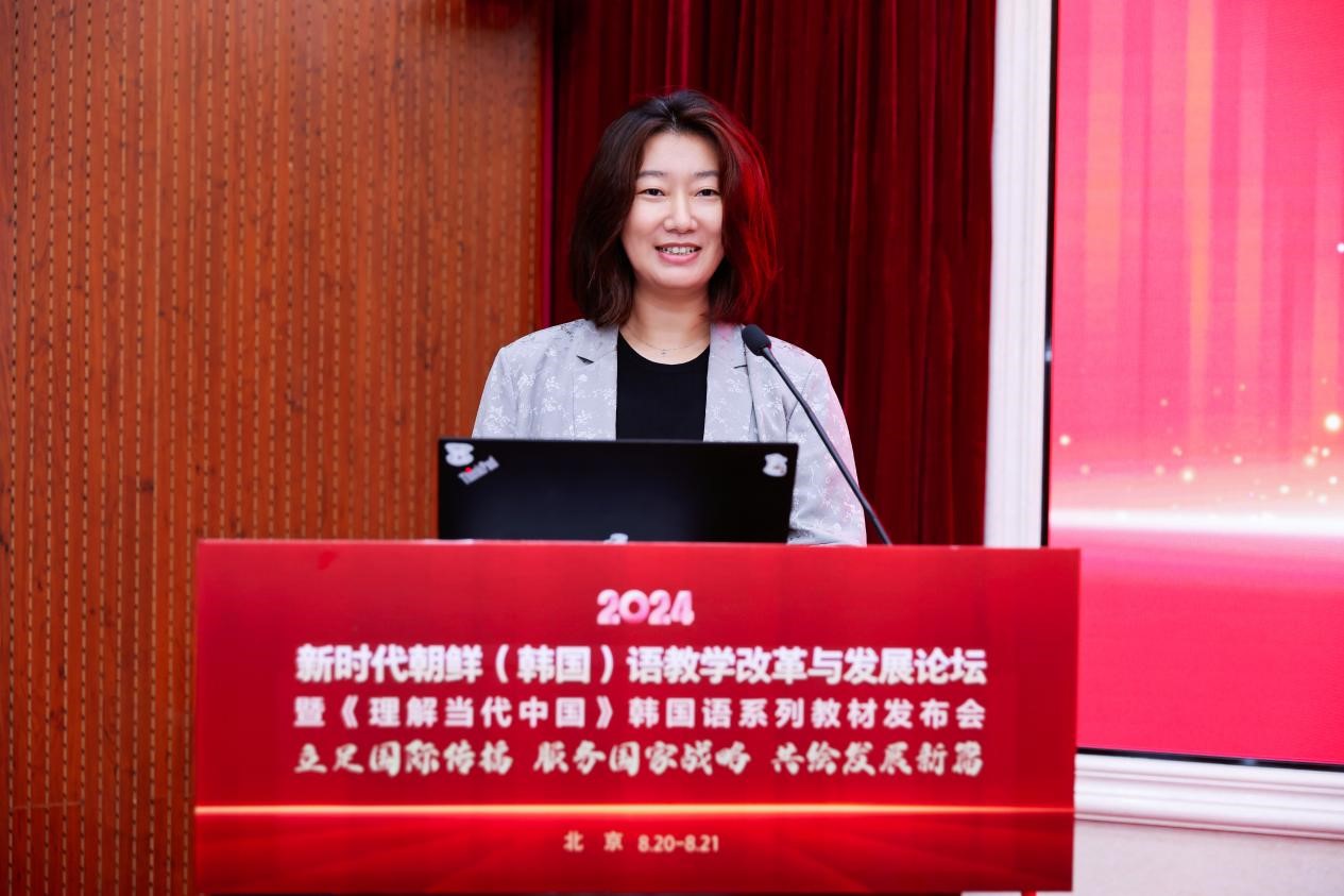 常小玲副总编辑代表外研社对莅临本次论坛的各位领导、专家和老师表示欢迎,对一直以来支持《理解当代中国》系列教材编写、出版和使用的外文局专家和高校专家表示感谢,同时也向韩国语系列教材编写团队表示祝贺。《理解当代中国》系列教材作为为国家培养国际传播人才的战略性工程和引领新时代我国外语教育发展的创新之作,对所有外语教师是一次思想和理念的洗礼。外研社将继续携手专家和教师团队,为推动朝鲜语专业改革创新不懈努力,为培养更多高水平国际化人才贡献力量,真正对接国家战略需求,将二十届三中全会强调的“构建更有效力的国际传播体系”落到实处。