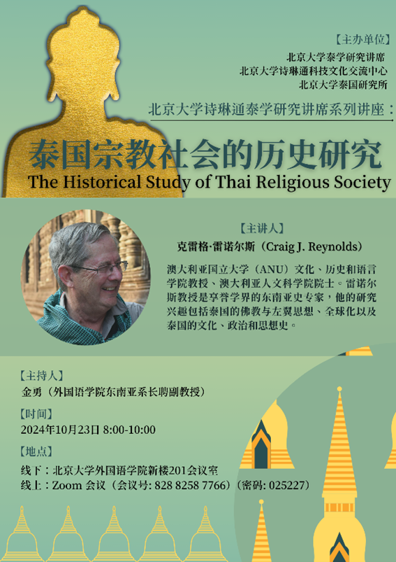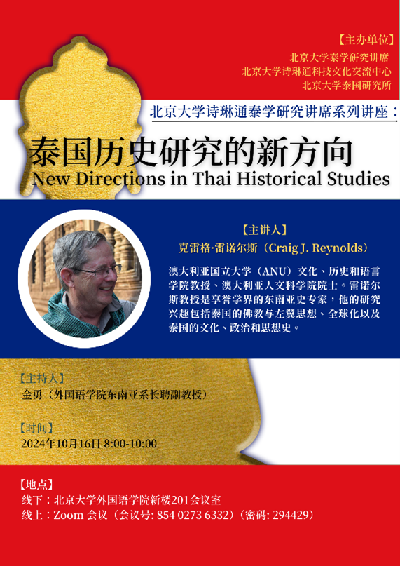 2024年10月16日和10月23日,应北京大学诗琳通泰学研究讲席和北京大学诗琳通科技文化交流中心邀请,著名东南亚史和泰国史学者克雷格·雷诺尔斯(Craig J. Reynolds)教授为北京大学师生进行了两场泰国史研究的线上学术讲座。讲座采取线上线下融合的方式,线下会场设于财神在线官网新楼201会议室。本次系列讲座也是“北京大学诗琳通泰学研究讲席系列讲座”的一部分。