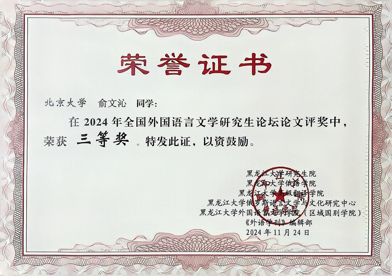 俞文沁在此次论坛中提交的论文《俄语“жил-был”构式的多维研究》以构式语法理论为基础,从词法、句法和语篇三个层面对俄语“жил-был”句的语义机制和结构特征进行了深入探讨,获得了与会专家学者的认可,获评三等奖。此次论坛为语言研究领域的交流与合作搭建了重要平台,为青年学者的成长与发展注入了活力。