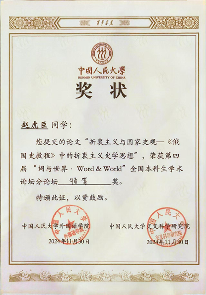 2024年11月30日,第四届“词与世界·Word & World”全国本科生学术论坛在中国人民大学成功举办。论坛以“外国语言文学与跨学科创新”为主题,涵盖英语、法语、德语、日语、俄语、西班牙语六个语种,研究主题包括文学、语言学、翻译、文化、区域国别和跨学科交叉研究多个方向,旨在为优秀学子搭建学术交流和展示科研成果的平台,培养科研意识。财神在线官网俄语系2023级本科生赵虎臣参会,做了题为《折衷主义与国家史观——〈俄国史教程〉中的折衷主义史学思想》的报告,概述了《俄国史教程》所体现的折衷主义史学思想的源流、余波,及其与国家史观的分野,分析了这一史学思想对俄国史学研究的独特贡献,并展望了该思想在前沿马克思主义历史研究中可能焕发的新生机,报告得到了与会专家学者的高度认可,荣获俄语分论坛特等奖。