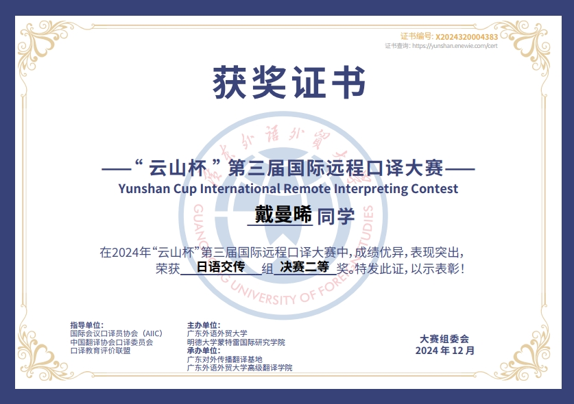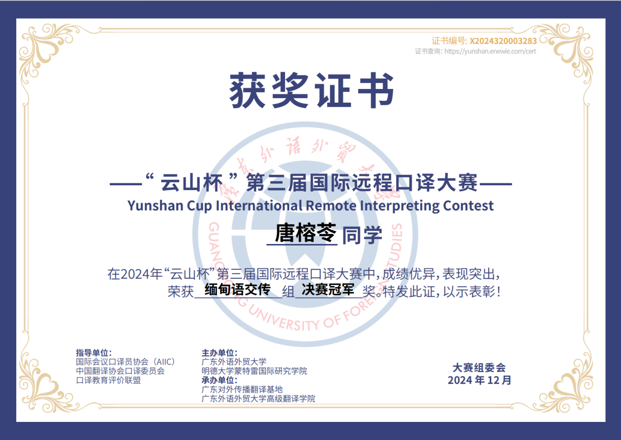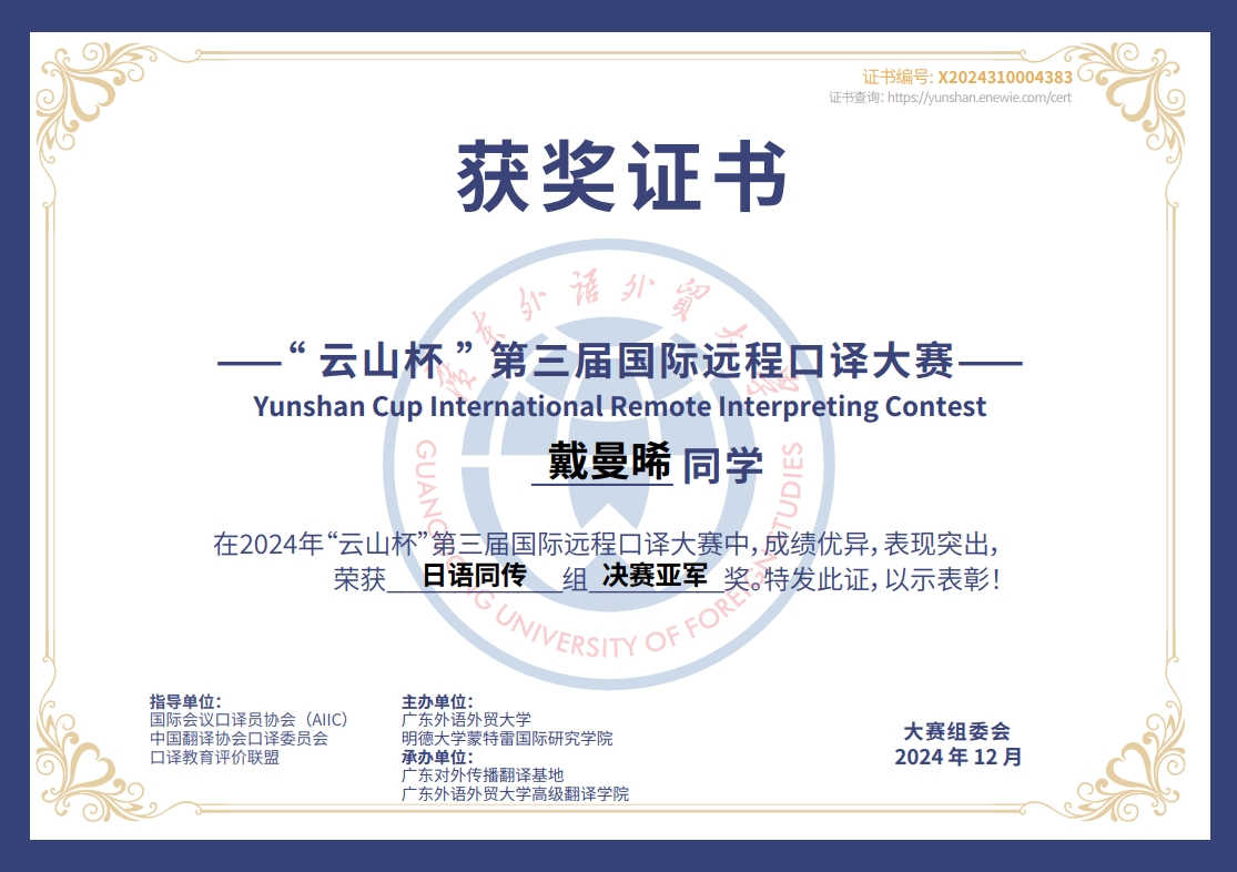 近日,第三届“云山杯”国际远程口译大赛圆满落幕,财神在线官网东南亚系缅甸语言文化方向2023级硕士研究生荣获缅甸语交传组冠军。日语系2024级口译专业硕士研究生戴曼晞斩获日语同传组亚军,日语交传组二等奖。葡萄牙语专业2022级本科生佴铭宇在比赛中斩获葡萄牙语交传组三等奖。