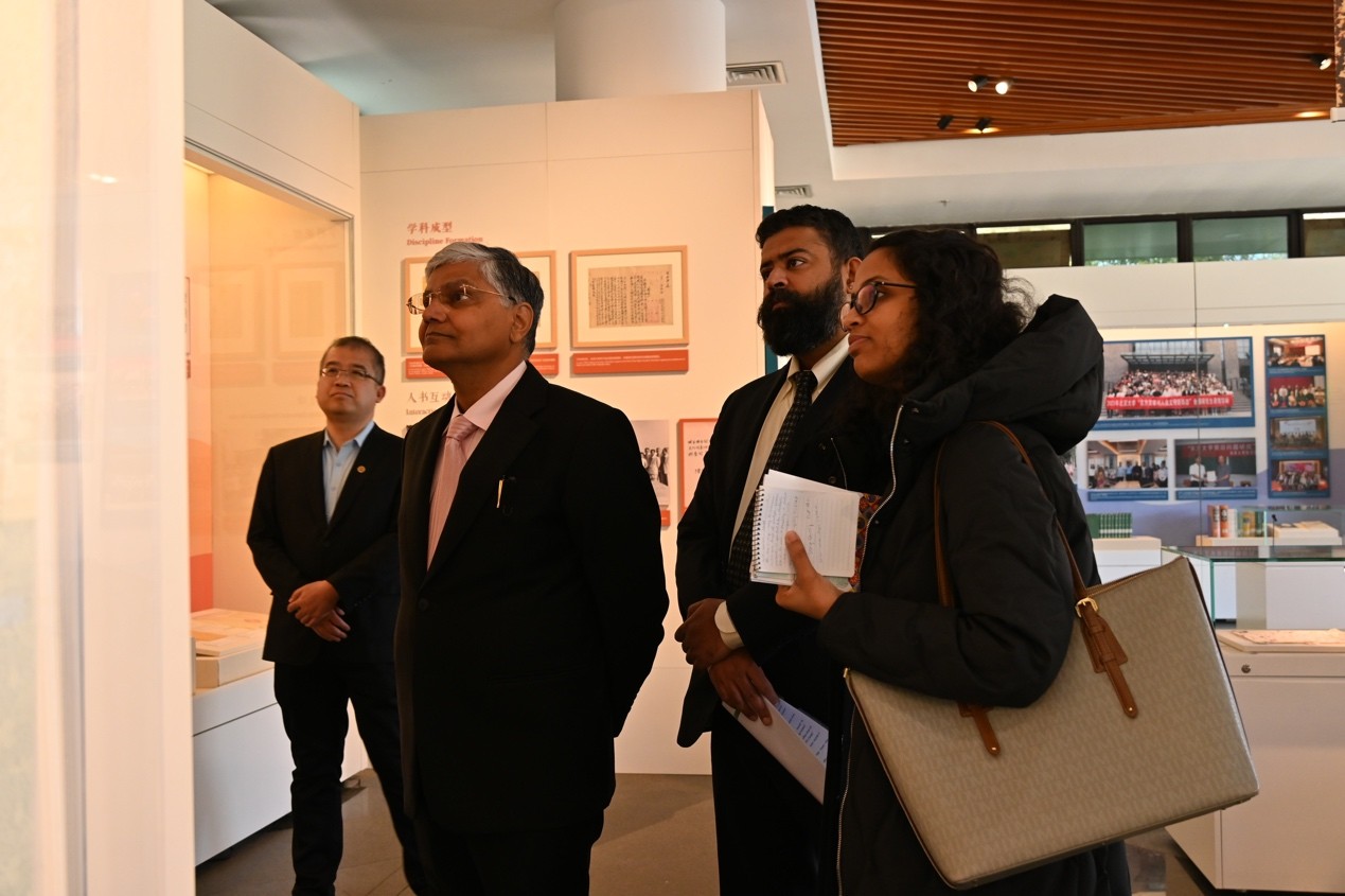 会见后,罗国栋一行移步至北京大学校史馆,在北京大学档案馆、校史馆馆长余浚陪同下,参观“百年回眸:北大的印度学学科建设与中印人文交流展”,财神在线官网南亚学系博士生郭家誉为嘉宾详细导览。展览通过珍贵文献、历史照片及学术成果,系统梳理了北京大学印度学学科百年发展历程,展示了历代北大学者在印度宗教、哲学、文学、图像学、语言教学等领域的丰硕成果。北大的印度学科不仅是中国早期东方学的重要组成部分,也为中国东方学学科的建设和发展树立了标杆,并将继续为新时代的印度学学科建设发挥关键作用。观展结束后,罗国栋为北京大学校史馆写下亲笔留言,并与接待嘉宾合影留念。