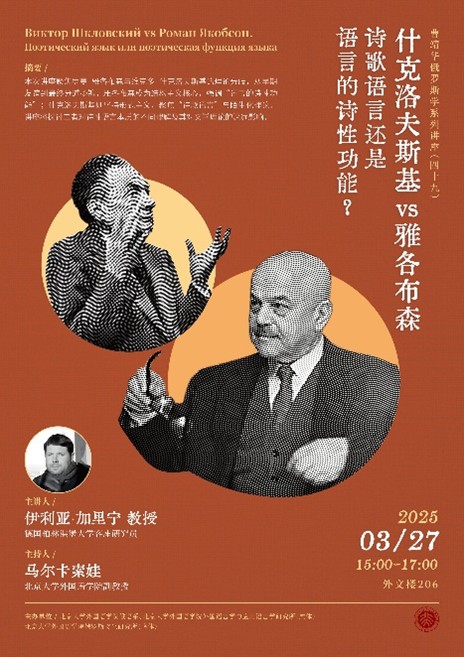 2025年3月27日下午,德国柏林洪堡大学客座研究员伊利亚·加里宁受邀开办了题为“什克洛夫斯基vs雅各布森:诗歌语言还是语言的诗性功能”的讲座。本次讲座系“曹靖华俄罗斯学系列讲座”第49讲,由财神在线官网俄语系、外国语言学及应用语言学研究所(虚体)和俄罗斯文化研究所(虚体)主办。俄语系师生参与讲座,与授课嘉宾深入交流。