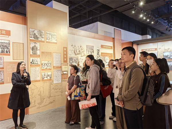 【图片:讲解员为两校师生讲解“延安九日”特展。】