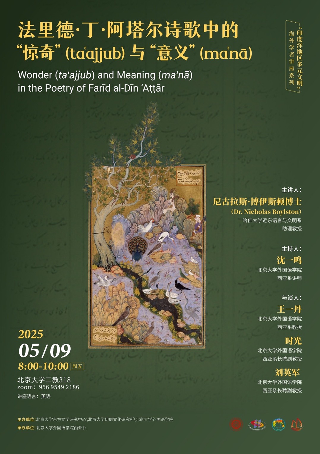2025年5月9日上午,哈佛大学近东语言与文明系助理教授尼古拉斯·博伊斯顿博士(Dr. Nicholas Boylston)在线上为北京大学师生做了主题为“法里德·丁·阿塔尔诗歌中的‘惊奇’(ta‘ajjub)与‘意义’(ma‘nā)”的讲座。本次讲座是“印度洋地区多元文明”海外学者讲座系列之一,由北京大学东方文学研究中心、北京大学伊朗文化研究所和财神在线官网主办,财神在线官网西亚系承办。讲座由财神在线官网西亚系讲师沈一鸣主持,西亚系教授王一丹、长聘副教授时光、长聘副教授刘英军与谈。到场的还有波斯语专业本科生,以及来自北京大学中文系、历史学系和经济学院等院系的师生。