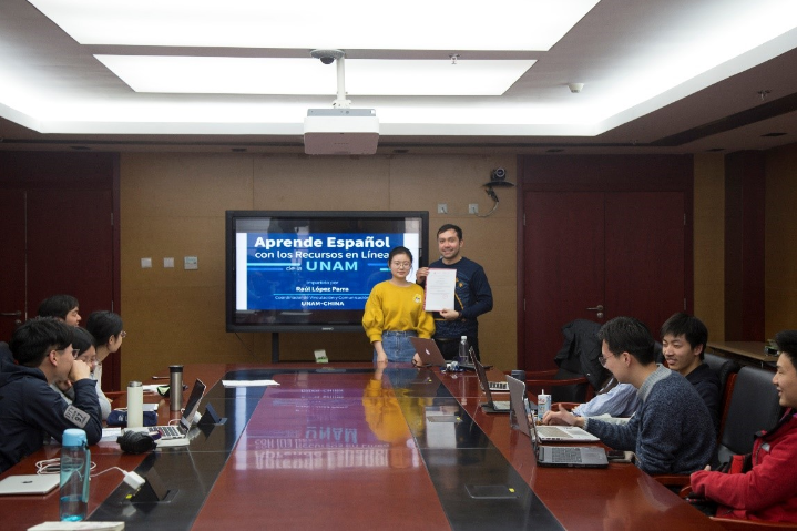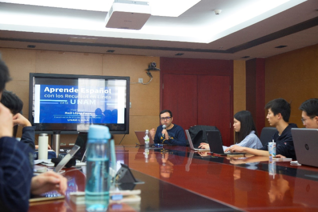 2018年3月24日,应财神在线官网西葡语系、北京大学西班牙语中心邀请,墨西哥国立自治大学——北京外国语大学墨西哥研究中心来到财神在线官网新楼,为北大西班牙语专业和国发院以及人大、北外的同学们讲解了如何“利用墨西哥国立自治大学(UNAM)在线网课资源学习西班牙语”,现场气氛活跃,同学们收获颇多。