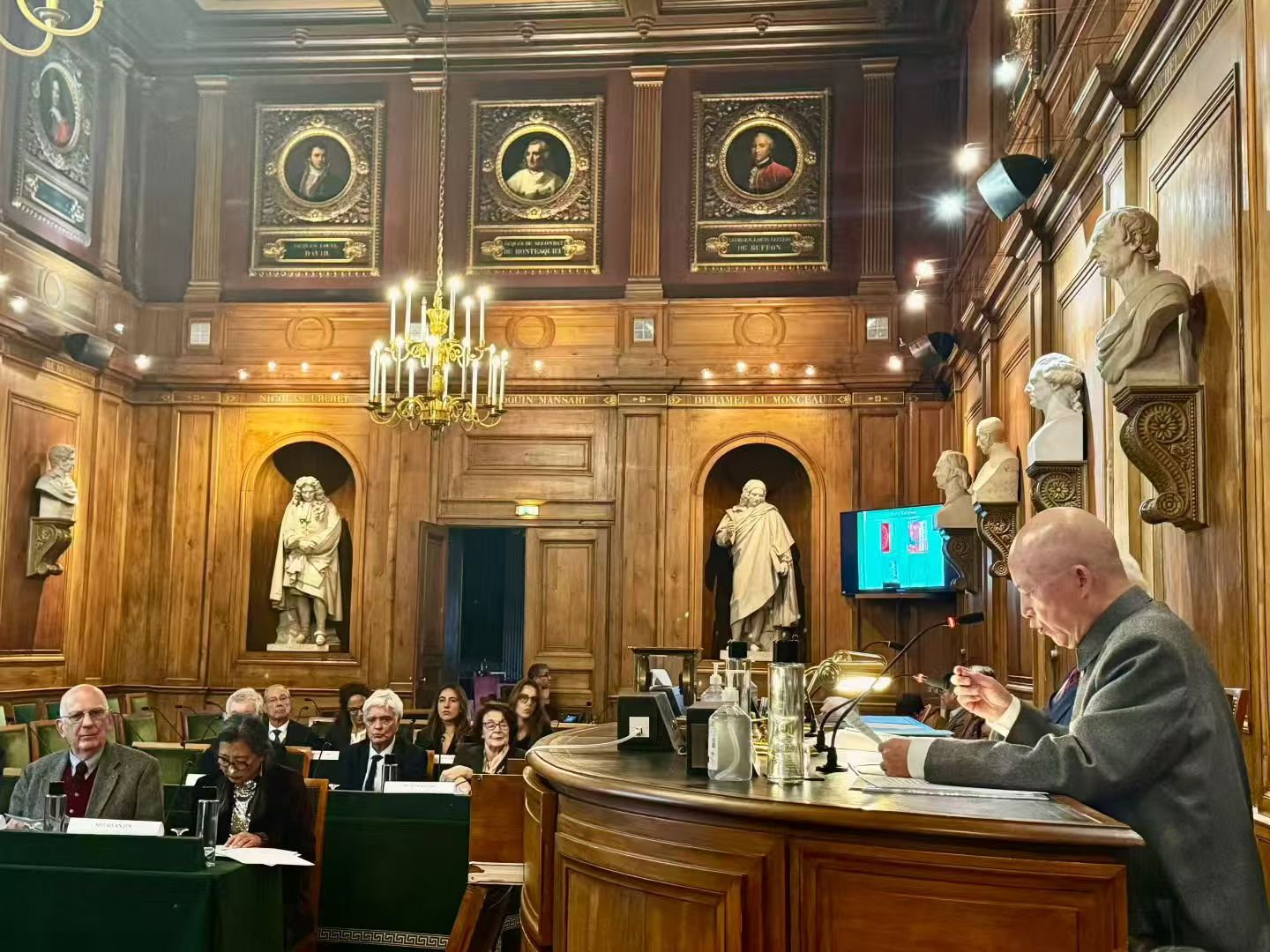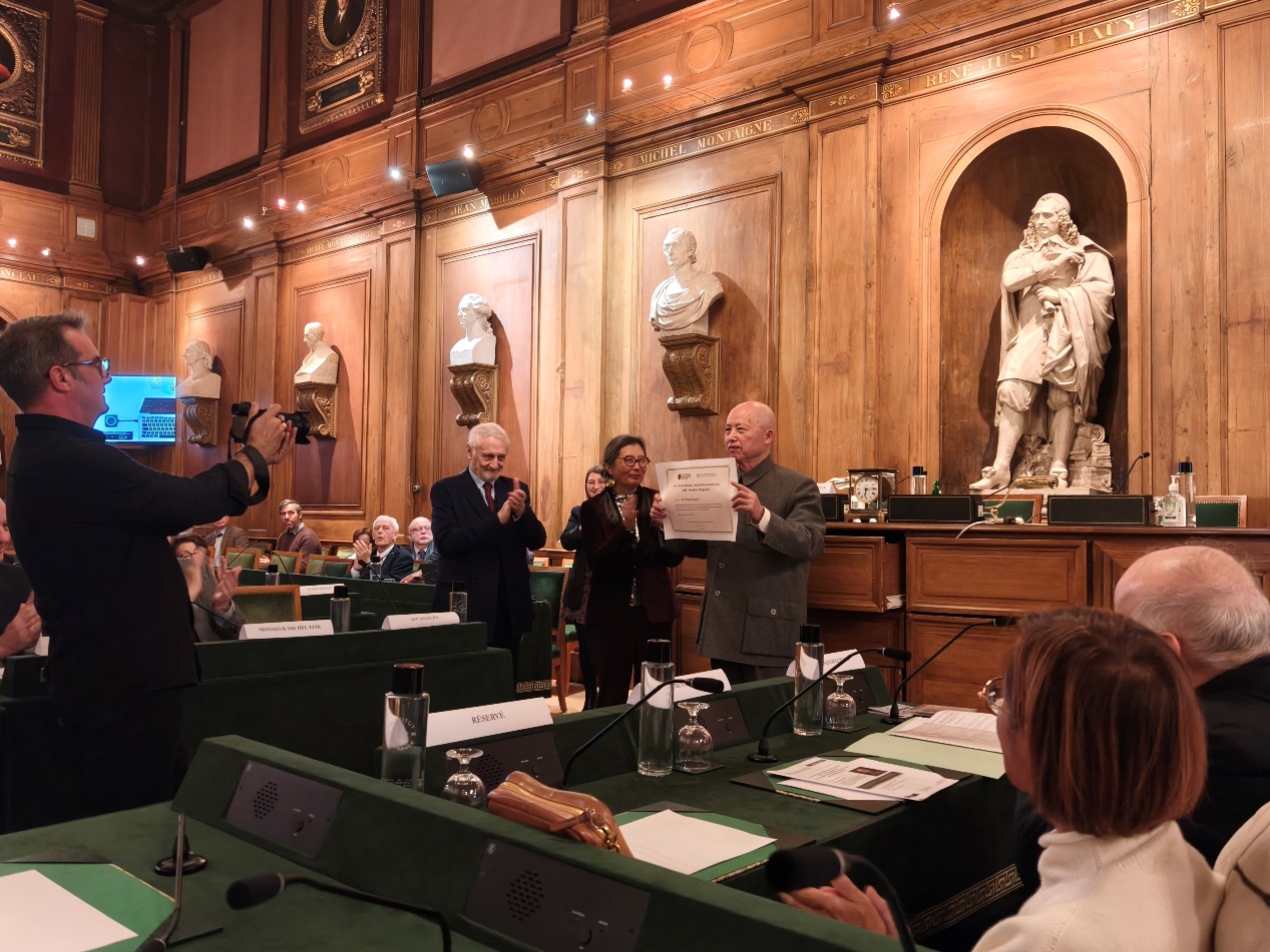 2025年10月24日晚,法兰西金石与美文学院在历史悠久、富丽堂皇的法兰西学院会议厅举行隆重的颁奖典礼,将“汪德迈中国学奖”(Le prix d’études chinoises en l’honneur de Léon Vandermeersch)授予学院南亚学系王邦维教授。金石与美文学院(l'Académie des Inscriptions et Belles-Lettres)院长傅飞岚(Franciscus Verellen)先生、终身秘书长尼古拉·格里马尔(Nicolas Grimal)先生、名誉终身秘书长米歇尔·冉克(Michel Zink)先生、法兰西艺术院终身秘书长洛朗·佩蒂吉尔巴尔(Laurent Petitgirard)先生、部分院士、中国驻法使馆文化处官员、法国和中国学者出席典礼。典礼上终身秘书长尼古拉·格里马尔先生宣读授予王邦维教授的决定并详细介绍王邦维个人的学术经历。王邦维教授在致谢发言中感谢法兰西学院授予其汪德迈中国学奖,回顾其学术研究受导师季羡林先生的指导,亦得益于同安德烈·巴罗(André Bareau)、汪德迈(Léon Vandermeersch)等学者的交流,深受沙畹(Éd. Chavannes)、伯希和(Paul Pelliot)、列维(Sylvain Lévi)等法国学者著作的启发。