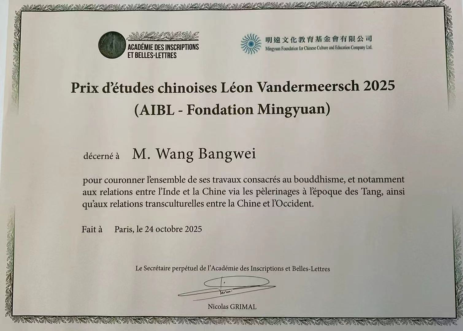 王邦维获2025年度“汪德迈中国学奖”获奖证书