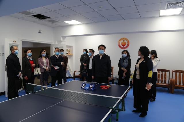 调研团队一行来到外文楼工会之家进行实地考察。作为北京市总工会“模范职工小家”,在本次外文楼、民主楼修缮过程中,外院同步进行了“工会之家”建设规划,特别设计使用运动场馆专用灯光,乒乓球比赛专用地面,配置了开水间、更衣室、淋浴间等必备设施,吸引了全院教职员工积极参加工会活动。同时加强楼宇文化建设,配合外文楼、民主楼装修风格,在内部布置、墙面装饰等细节处下功夫,营造百年外语学府独有的文化氛围,体现北大外院人“学贯中西,道通古今”的精神追求。