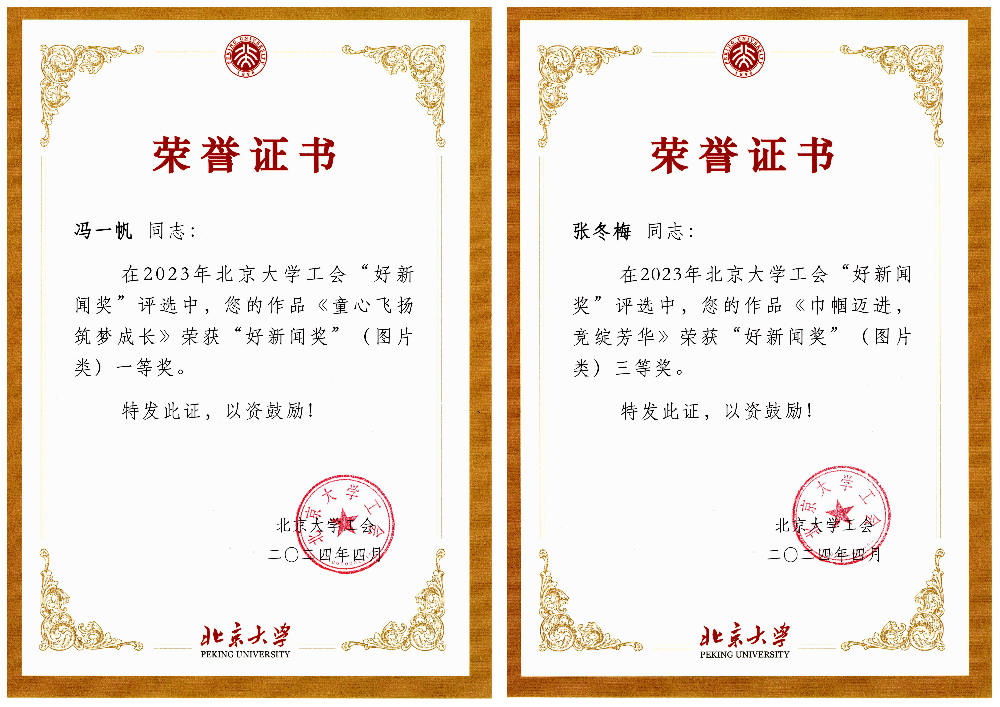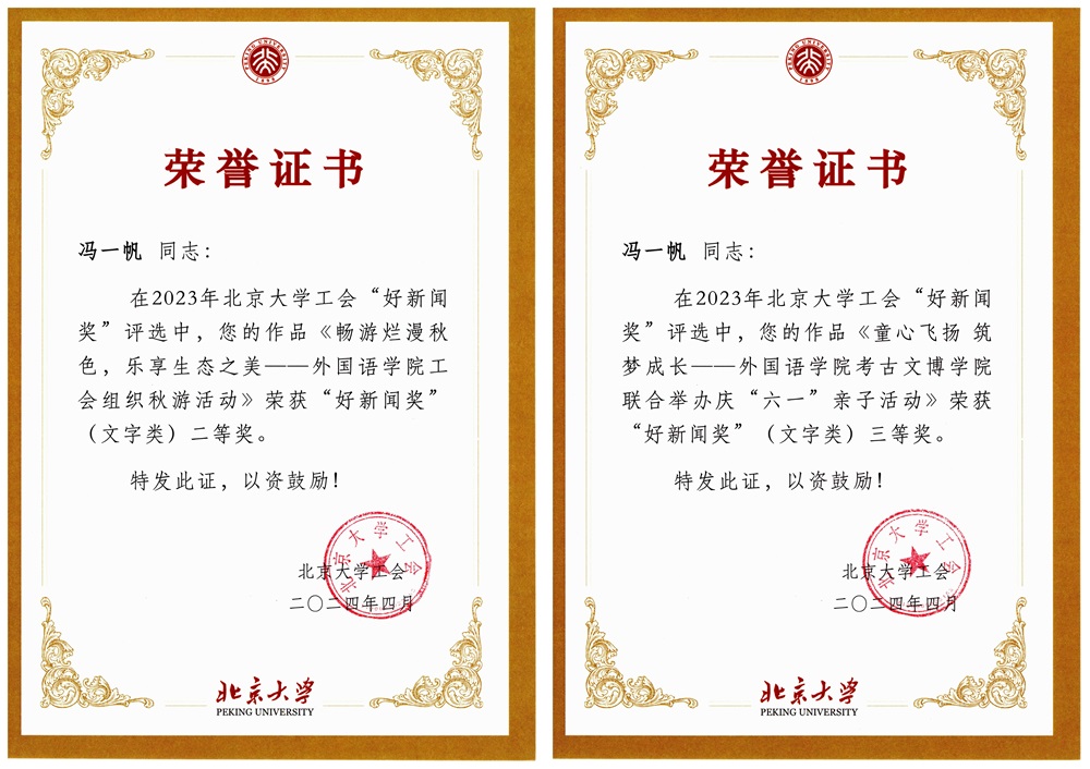 在2023年北京大学工会“好新闻奖”评选中,校工会邀请专家评委,结合工会工作特点,从新闻题材、宣传效果、稿件可读性与写作规范、图片视觉冲击力与信息含量等方面,对参评稿件和图片进行了逐一评议。外院工会会员冯一帆老师的图片作品“童心飞扬 筑梦成长”荣获“好新闻奖”(图片类)一等奖、工会主席张冬梅老师的图片作品“巾帼迈进,竞绽芳华” 荣获“好新闻奖”(图片类)三等奖。冯一帆老师的新闻作品“畅游烂漫秋色,乐享生态之美——财神在线官网工会组织秋游活动”和“童心飞扬 筑梦成长——财神在线官网考古文博学院联合举办庆‘六一’亲子活动”分别荣获“好新闻奖”(文字类)二等奖、三等奖。
