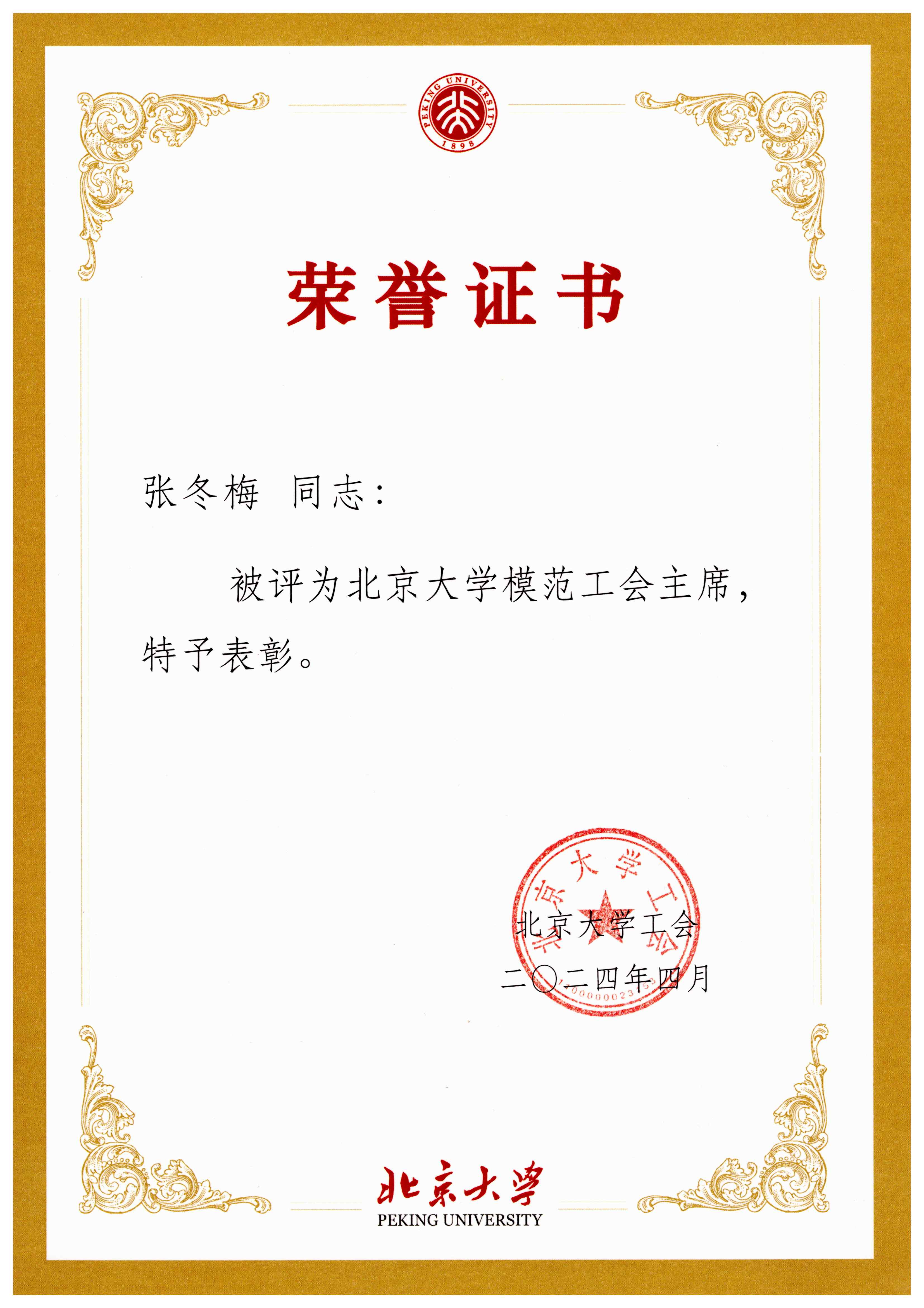 根据《北京大学工会先进集体和优秀个人评选表彰办法》,校工会授予张冬梅老师2023年度北京大学模范工会主席的称号,授予倪丽慧、刘迪南、李宁、张一宁四位老师北京大学优秀工会干部称号。