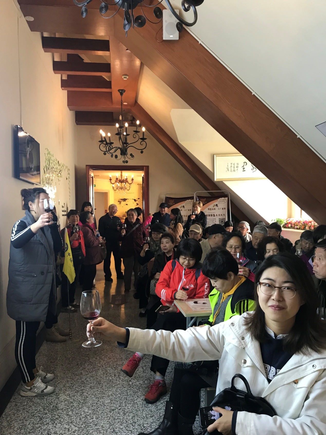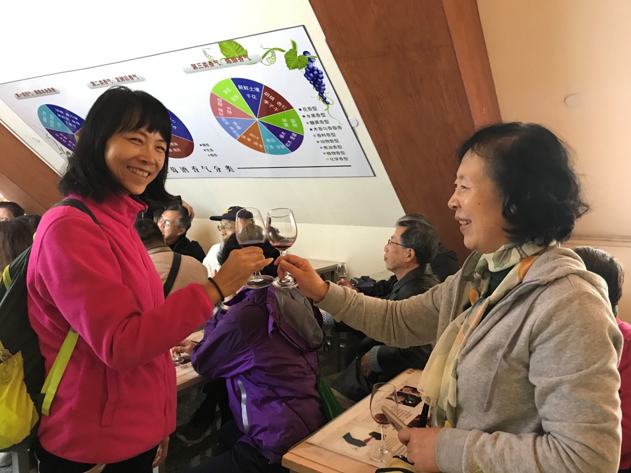 博物馆参观结束,我们终于来到三层专业品酒室品酒。我们品尝的两种酒分别是干红葡萄酒和桃红葡萄酒。讲解员从葡萄酒的挂杯、持杯(男女有别)到干杯,以及品酒三步曲,一路娓娓道来,并亲自示范,大家听得聚精会神、兴趣盎然。一边听着讲解员讲解葡萄酒文化及相关知识,一边按照品酒步骤品尝红黄两色、香气袭人的葡萄酒,感觉真是一种美妙的人生体验,那种唇齿留香的滋味,令人回味无穷。