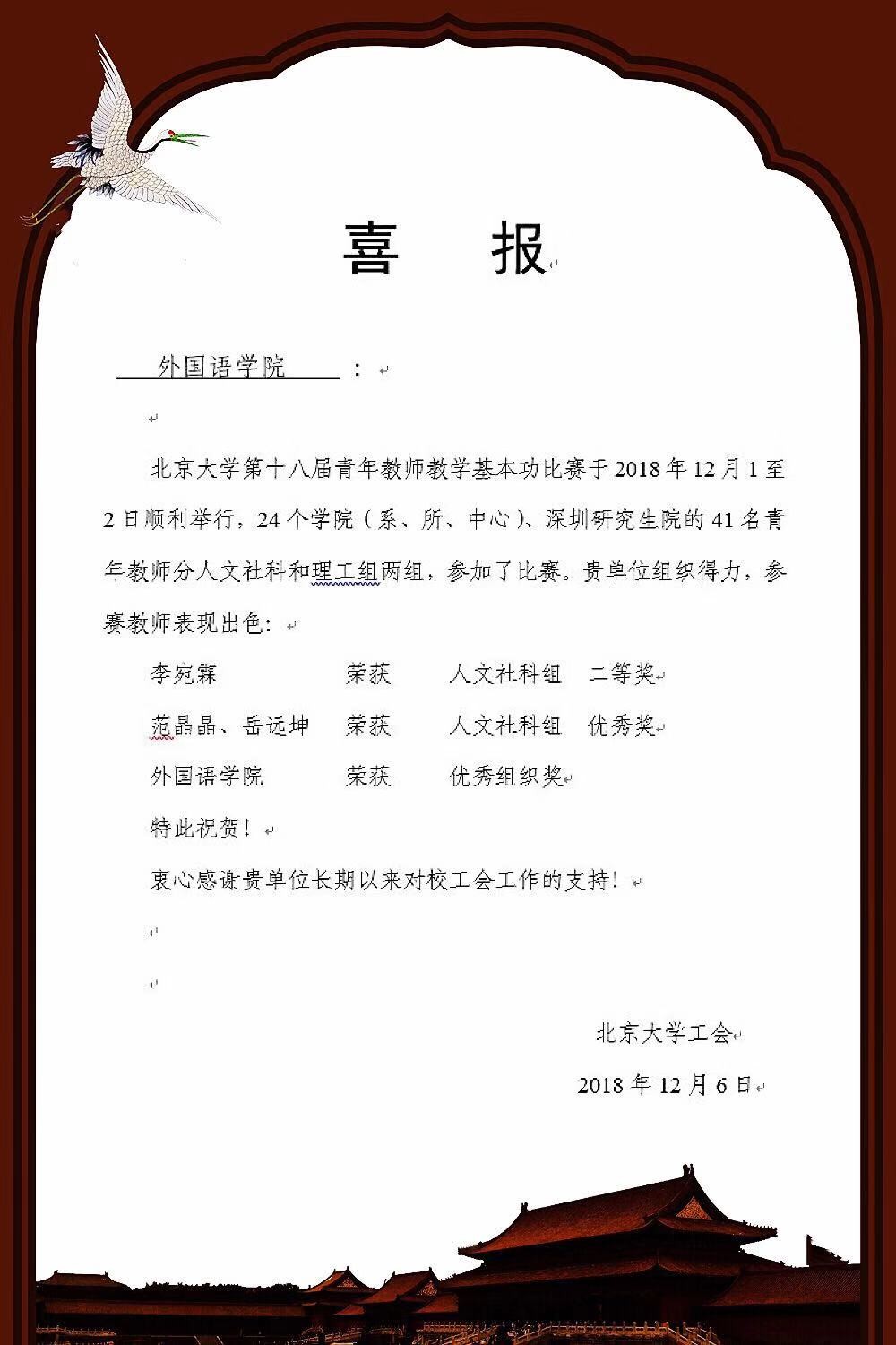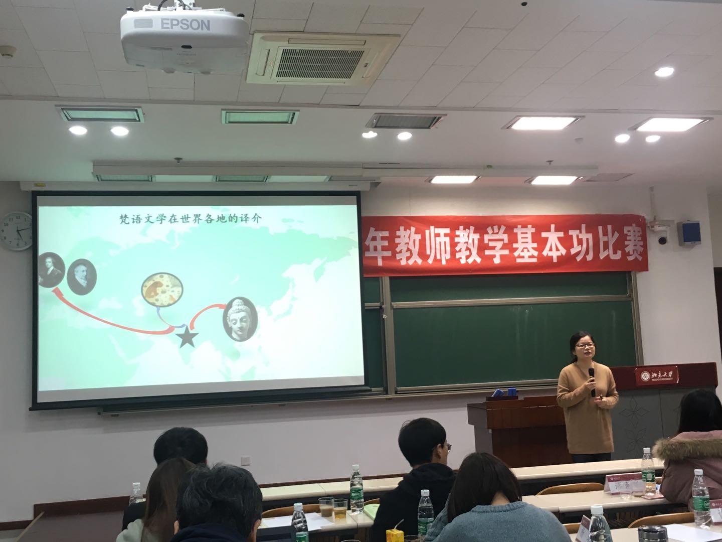 2018年12月1日,北京大学第十八届青年教师教学基本功大赛在理教201教室如期举行。此次教学基本功大赛分为文科、理科两个组别进行比赛。文科组有来自全校15个文科院系的22位老师参赛。财神在线官网有英语系李宛霖老师、日语系岳远坤老师和南亚系范晶晶老师参加了此次比赛。经过一天的紧张角逐,李宛霖老师的《改编——关于变化的争议》课程展示获得文科组第二名,岳远坤老师《笔译专家指导儿童绘本翻译的原则和方法》课程展示和范晶晶老师的《缘——中印文学交流的个案分析》课程展示获得优秀奖,财神在线官网获得优秀组织奖。