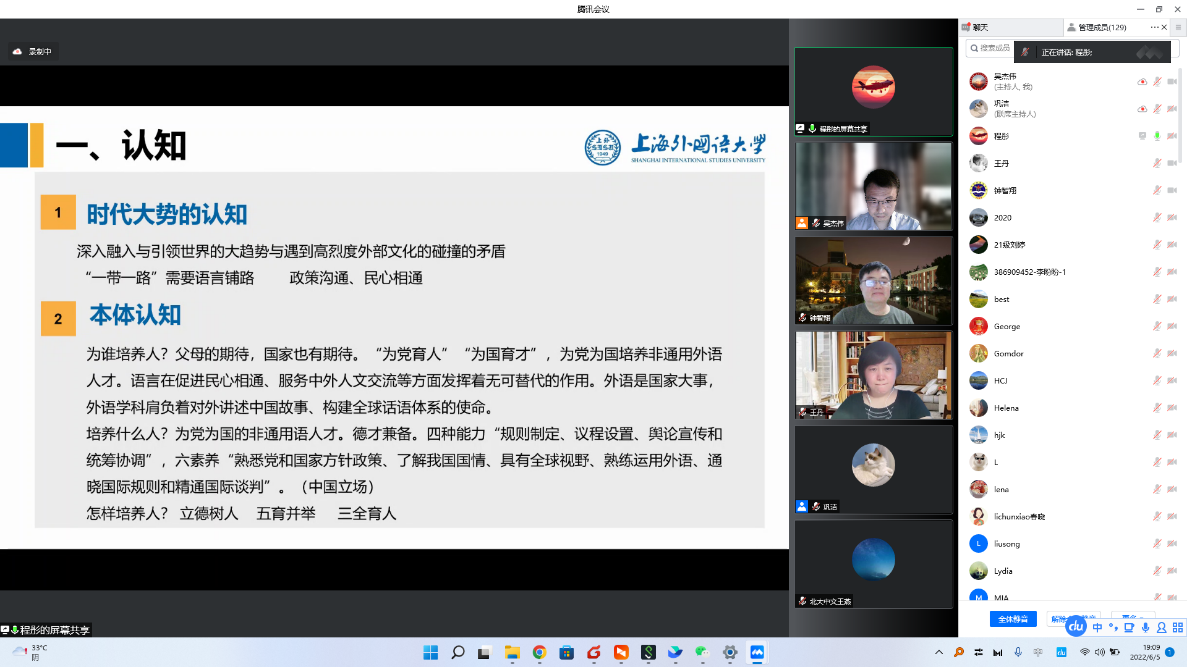 参加讲座的师生就课程思政的评价机制、具体实践、教学效果等方面的议题展开了热烈的讨论。本次讲座聚焦于外语非通用语课程思政的认知与实践,详细介绍了学生培养、教师培育、思政实践等内容和方法,是程彤教授多年教学经验的总结,有助于推动全国非通用语思政课程建设进一步走向深入。