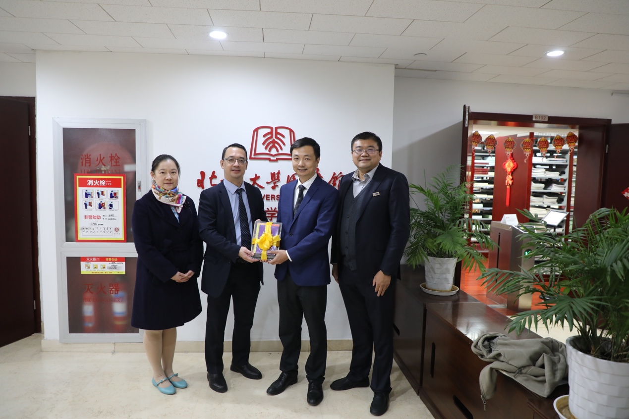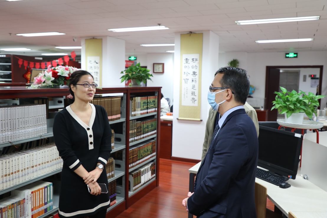 展映活动结束后,欧帝诺代办一行前往财神在线官网图书分馆参观并赠书,馆长张晓雁详细介绍了分馆的历史和藏书规模。在东南亚系主任史阳及菲律宾语教研室教师黄轶的陪同下,使馆工作人员一同参观了菲律宾研究的相关馆藏。
