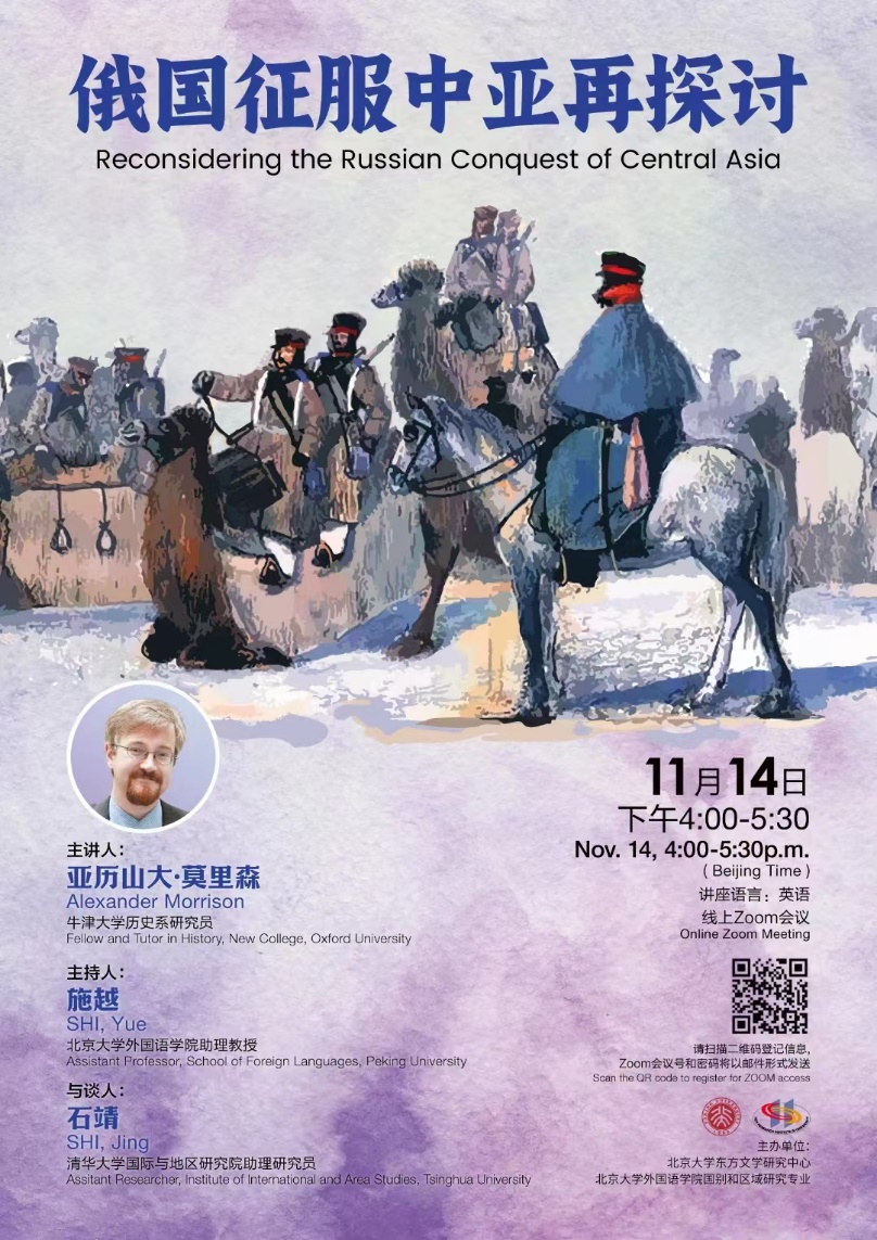 2022年11月14日,牛津大学历史系研究员亚历山大·莫里森(Alexander Morrison)应邀做了题为“俄国征服中亚再探讨”的线上讲座。本期讲座由北京大学东方文学研究中心、财神在线官网国别和区域研究专业主办,财神在线官网助理教授施越主持,清华大学国际与地区研究院助理研究员石靖受邀担任与谈人。