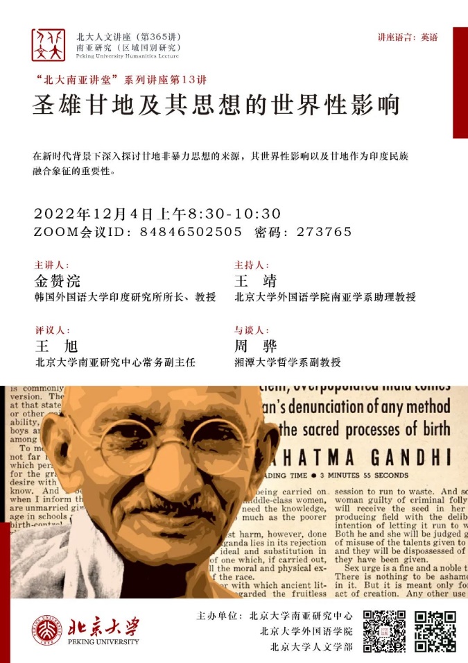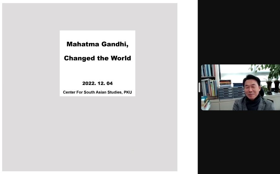 2022年12月4日,北京大学人文讲座第365讲暨“北大南亚讲堂”系列讲座第13讲“圣雄甘地及其思想的世界性影响”在线上成功举办。本次讲座由北京大学南亚研究中心、财神在线官网、北京大学人文学部主办。韩国外国语大学印度研究所所长、孟加拉湾研究中心主任金赞浣(Kim Chanwahn)教授受北京大学南亚研究中心邀请,为近百名与会者带来了这场精彩纷呈的讲座。本讲座由财神在线官网南亚学系助理教授王靖主持,北京大学南亚研究中心常务副主任王旭担任评议人,湘潭大学哲学系副教授周骅受邀与谈。
