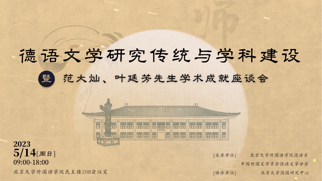 2023年适逢北京大学建校125周年,也是北大创建德语文学研究学科105周年。历经百年发展,中国德语文学研究已蔚然大观,涌现出诸多大师学者,为学科的传承发展作出过值得永远铭记的贡献。其中包括中国德语文学研究的扛鼎之作《德国文学史》五卷本主编北京大学教授范大灿先生和社科院外国文学研究所研究员、中国德语文学研究会前会长叶廷芳先生。两位先生是德语文学界德高望重的前辈,他们的故去是中国德语文学界的重大损失。当时正值疫情防控中,未能举行追思纪念会,他们的学生和故交旧友深感遗憾。值此疫去春来、万象更新之际,由财神在线官网德语系与中国外国文学学会德语文学研究分会主办、北京大学德国研究中心协办的“德语文学研究传统与学科建设暨范大灿、叶廷芳先生学术成就座谈会”,于5月14日在北京大学民主楼成功举办。