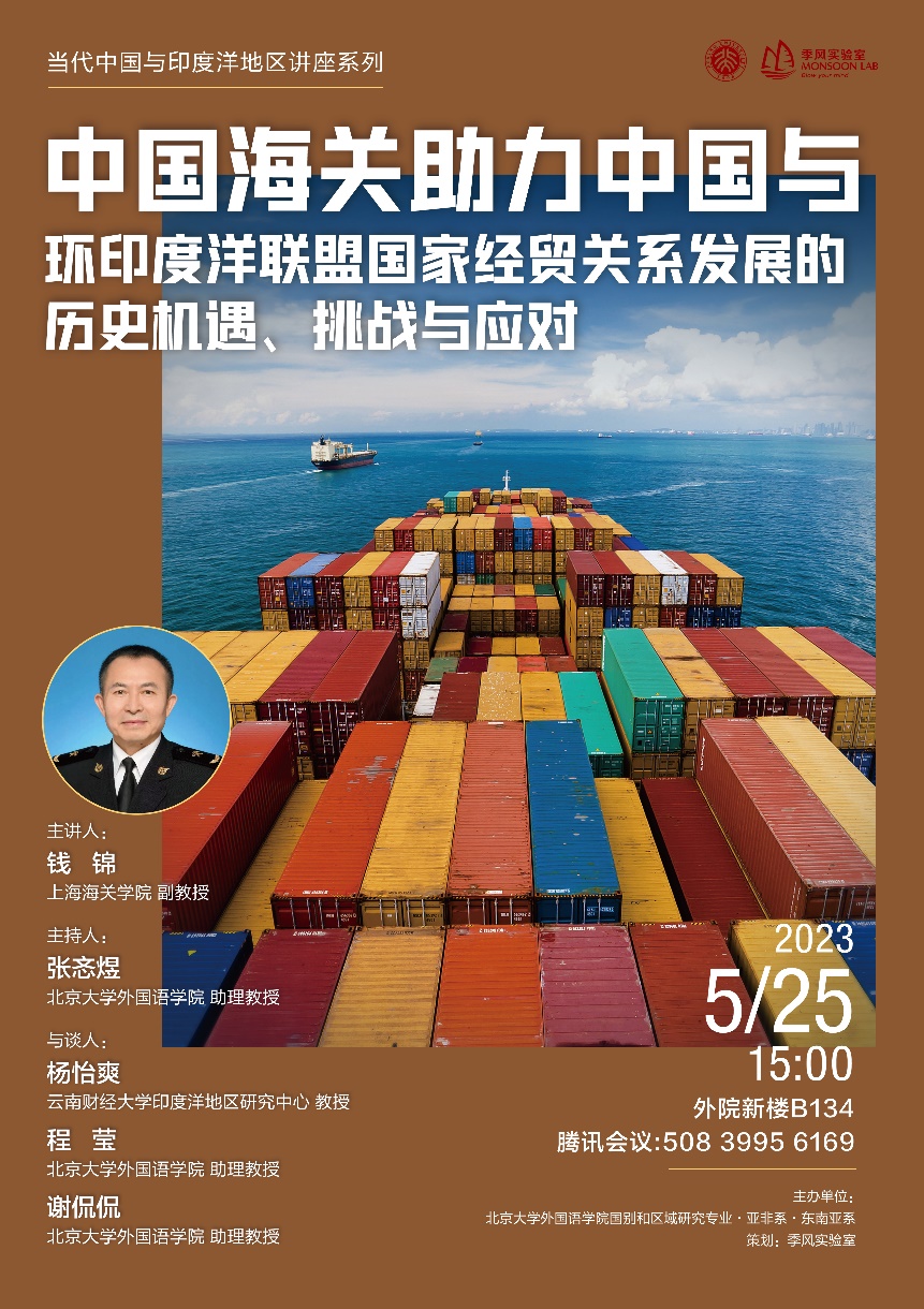 2023年5月25日,上海海关学院副教授钱锦应邀为我院师生进行题为“中国海关助力中国与环印度洋联盟国家经贸关系发展的历史机遇、挑战与应对”的讲座。本次讲座是“当代中国与印度洋地区”系列讲座的第二讲,由财神在线官网国别和区域研究专业、亚非系和东南亚系主办,财神在线官网张忞煜助理教授主持,云南财经大学印度洋地区研究中心杨怡爽教授、北大外院程莹助理教授和谢侃侃助理教授参与讨论。本次讲座在外院新楼B134会议室和线上平台同步举行,来自各高校的近百名师生在线参与讲座。