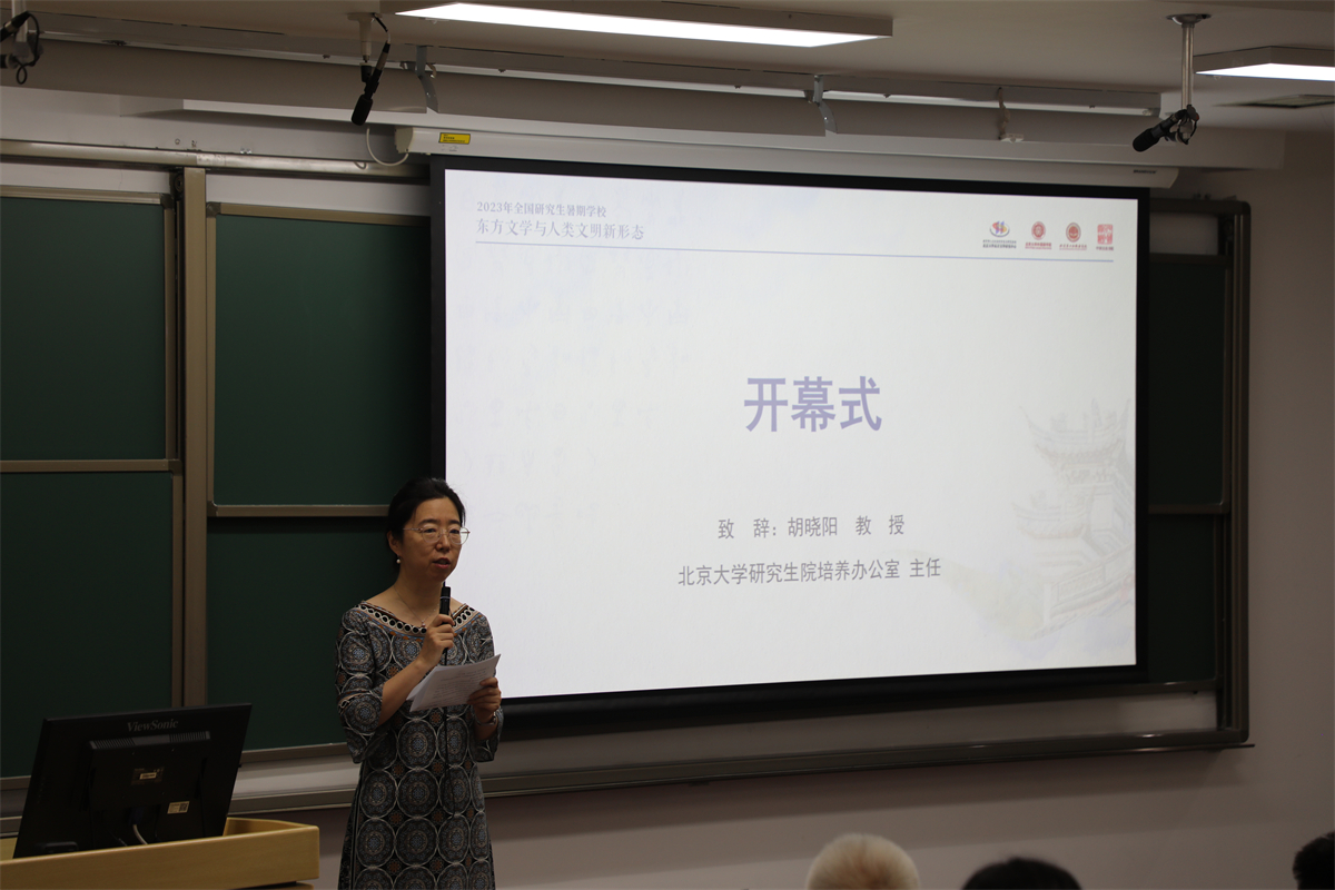 北京大学研究生院培养办公室胡晓阳主任对东方文学暑期学校自2009年以来的建设历程进行了回顾。她指出,本届暑期学校以“东方文学与人类文明新形态”作为切入点,将东方文学研究置于世界多元文明共存的视野下,为东方各国的文学研究提供了中国视角,与此同时,结合多个学科的思想理论和学术实践,探索新时代语境下的东方文学研究,将这种理论思考和学术实践运用到研究生的培养中,既包含对北京大学东方文学研究优秀传统的继承,又涉及国内外东方文学前沿发展的方向。随后,她代表北京大学研究生院对主办和协办单位以及授课的专家学者的大力支持表示感谢,并希望学员们在本届暑期学校中加强交流,互相学习,收获专业知识,建立学术联系,取得研究进展。
