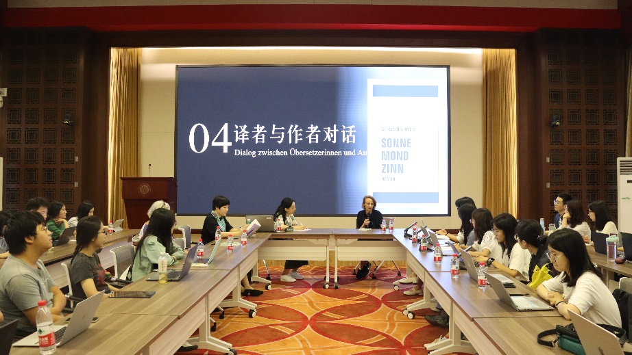 两位作家受邀在德语系举办系列翻译工作坊。首场“与作者面对面——亚历山德拉·里德尔作品翻译工作坊”于2023年9月19日下午在民主楼208会议室成功举办。本次活动由黄超然老师策划、指导和主持,北京歌德学院信息中心主任、图书馆馆长鲍雅女士(Michaela Bodesheim),歌德学院图书馆文学及翻译资助项目负责人姜宁馨女士,德语系主任胡蔚老师出席活动。德语系本科生、研究生齐聚一堂,与亚历山德拉·里德尔围绕其作品《太阳、月亮、锡恩》展开讨论。