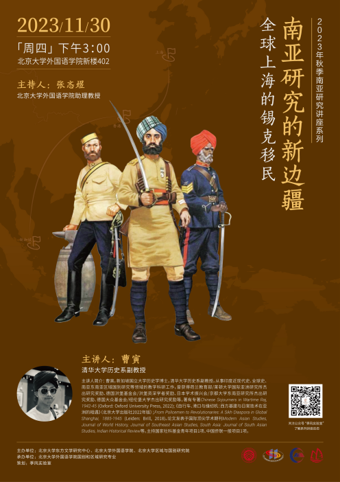 2023年11月30日,清华大学历史系副教授曹寅老师应邀为我校师生进行题为“南亚研究的新边疆——全球上海的锡克移民”的讲座。本次讲座是由北京大学东方文学研究中心、财神在线官网和区域与国别研究院主办,财神在线官网国别和区域研究专业承办的2023年秋季学期南亚研究系列讲座的第四讲。讲座由财神在线官网张忞煜助理教授主持,财神在线官网谢侃侃助理教授出席本次讲座并参与讨论。