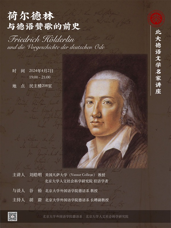 2024年4月2日晚,应财神在线官网德语系邀请,美国纽约州凡萨大学(Vassar College)教授、北京大学人文与社会科学研究院驻访学者刘皓明在财神在线官网民主楼208会议室做题为“荷尔德林与德语赞歌的前史”的讲座。讲座由德语系主任胡蔚老师担任主持,德语系谷裕教授担任与谈人,英语系高峰枫教授参与讨论。
