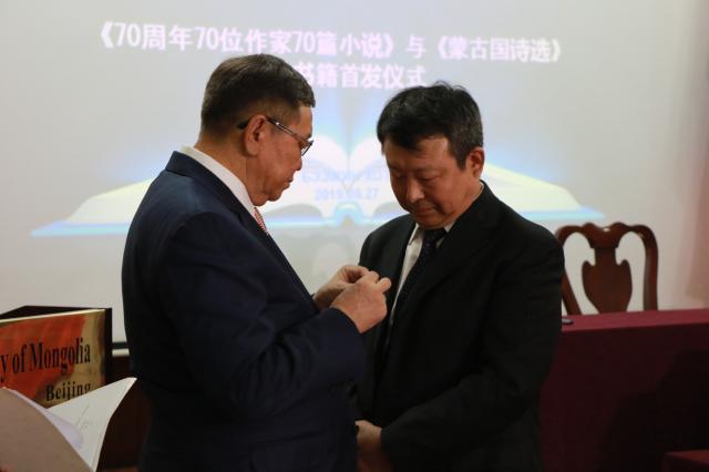 2019年9月27日,《70周年70位作家70篇小说》(蒙古文版)和《蒙古国诗选》(中文)图书首发仪式在蒙古国驻华大使馆会议室举行。中国外交部亚洲司陈少春参赞、蒙古国驻华大使丹•钢呼雅格、前中华人民共和国驻蒙古国大使黄家骙、三位前蒙古国驻华大使和《“一带一路”沿线国家经典诗歌文库》主编赵振江教授以及来自中国作家协会、中国文字著作权协会、中国社会科学院、北京大学、中央民族大学和媒体代表等共120余人参加了首发仪式。