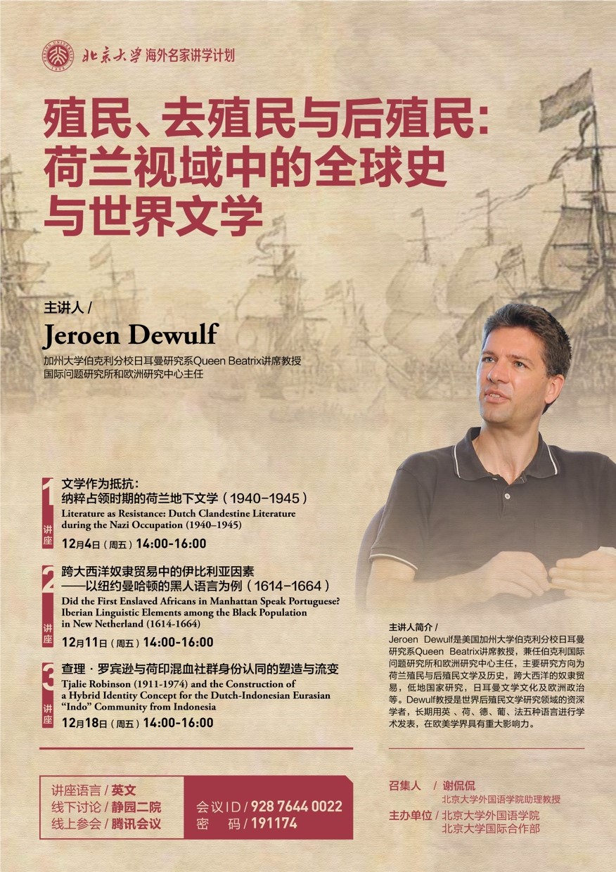 2020年12月,财神在线官网在国际合作部“海外名家讲学计划”的支持下主办了三场题为“殖民、去殖民与后殖民:荷兰视域中的全球史与世界文学”的系列讲座。主讲人杰罗恩•德伍夫(Jeroen Dewulf)是加利福尼亚大学伯克利分校日耳曼研究系贝娅特丽克丝女王讲席教授(Queen Beatrix Chair Professor),兼任伯克利国际问题研究所和欧洲研究中心主任,主要研究方向为荷兰殖民与后殖民文学及历史,跨大西洋的奴隶贸易,低地国家文化,日耳曼文学及欧洲政治等。德伍夫教授是世界殖民与后殖民研究领域的资深学者,长期用英 、荷、德、葡、法五种语言进行学术发表,在欧美学界具有重大影响力。受疫情影响,德伍夫教授未能到达燕园现场,因此系列讲座以线上线下相结合的方式进行,演讲同时在腾讯会议、哔哩哔哩等网上平台上直播,吸引了北京大学校内外的众多学者和同学观看、学习和讨论。