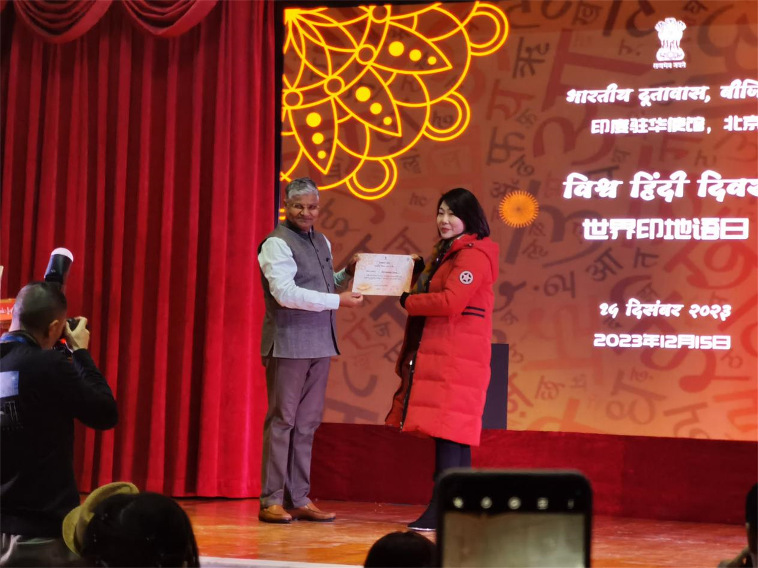 庆祝活动在印度驻华大使罗国栋(Pradeep Kumar Rawat)先生及学界前辈的致辞中拉开帷幕。庆祝活动包括“印地语诗歌朗诵比赛”和“印地语节目展演”等环节,来自北京大学、清华大学、北京外国语大学、中国传媒大学、北京第二财神在线官网等高校师生和中国国际广播电台国际在线印地语部记者以及在京印度留学生参加该庆祝活动。我院南亚学系印地语专业师生在活动中表现优异,取得佳绩:2021级印地语专业本科生李依诺在“印地语诗歌朗诵比赛”中获最佳表现奖,2021级和2023级印地语本科生的积极展演获得赞誉,我院印地语专业喜获“优秀组织奖”,印地语专业教师代表王靖、贾岩获“优秀指导奖”。