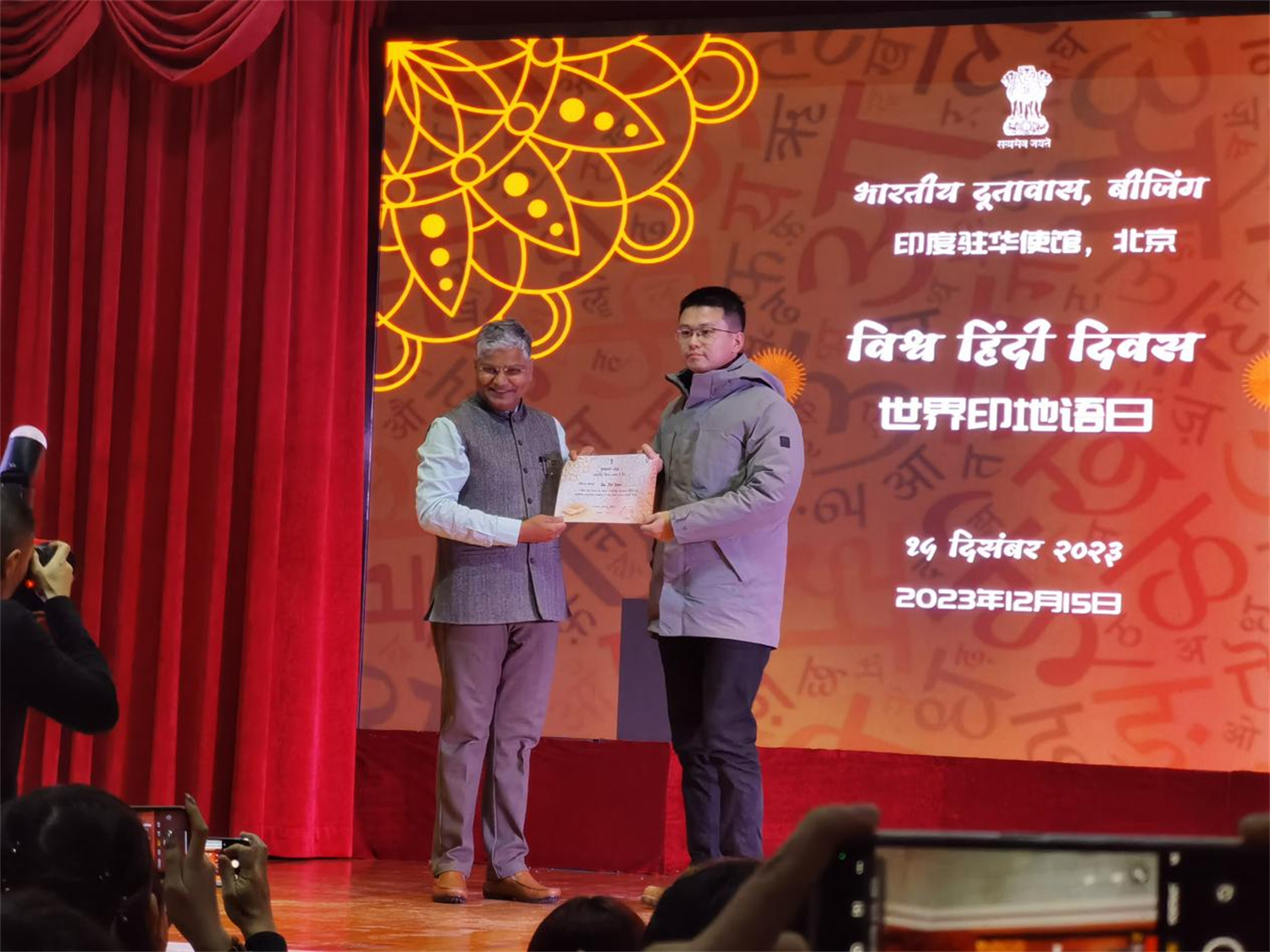 2023年12月15日下午,印度驻华使馆举办2024年“世界印地语日(World Hindi Day)”庆祝活动,财神在线官网南亚学系印地语专业师生代表应邀赴使馆参加活动。