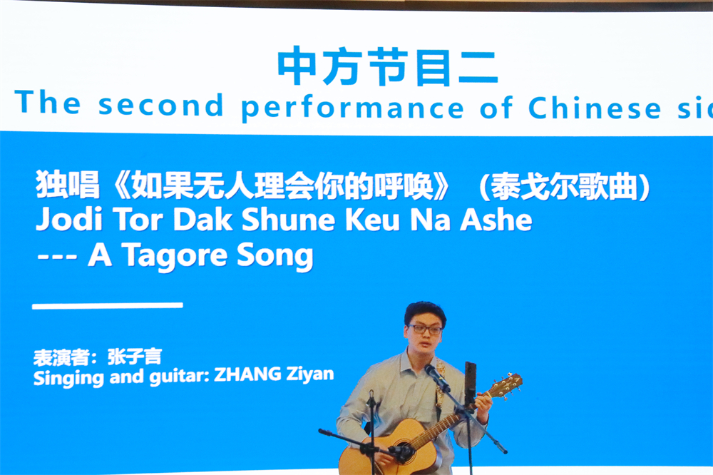 泰戈尔音乐家曼诺杰·穆拉尼(Manoj Murali)在会上倾情演唱了孟加拉语的泰戈尔歌曲。他表示,自己在中国听到孟加拉语感到特别亲切,作为一名在圣蒂尼克坦生活了三十多年并在泰戈尔创办的印度国际大学学习了泰戈尔音乐专业的艺术家,泰戈尔歌曲最能传递他的心情。