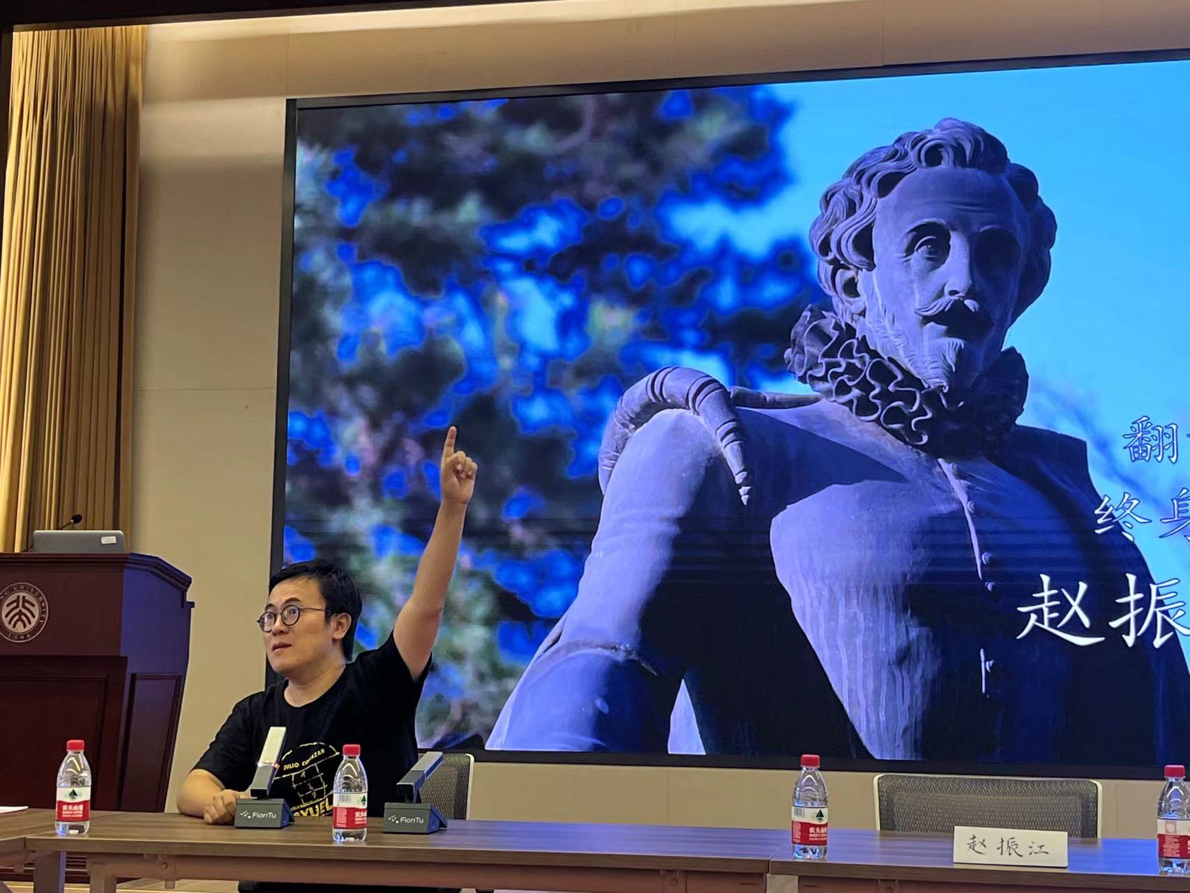 之后,赵老师的讲述进一步深入到了文学。谈话间,老师比较了中国文学与西班牙语文学,提出中国可能早就有所谓的魔幻⼩说,还列举了博尔赫斯幻想文学选里面提到的《红楼梦》的选段作为例子。讲座间他还谈到,虽然我国文学基本上按照西方体系的定义进行分类,但实际上,外国文学的分类体系与我们中国的文学作品的很多方面并不是非常贴合。关于这个现状,赵老师强调,“我们还是要⾃⼰发展⾃⼰的学问,不能只依靠外国的。”