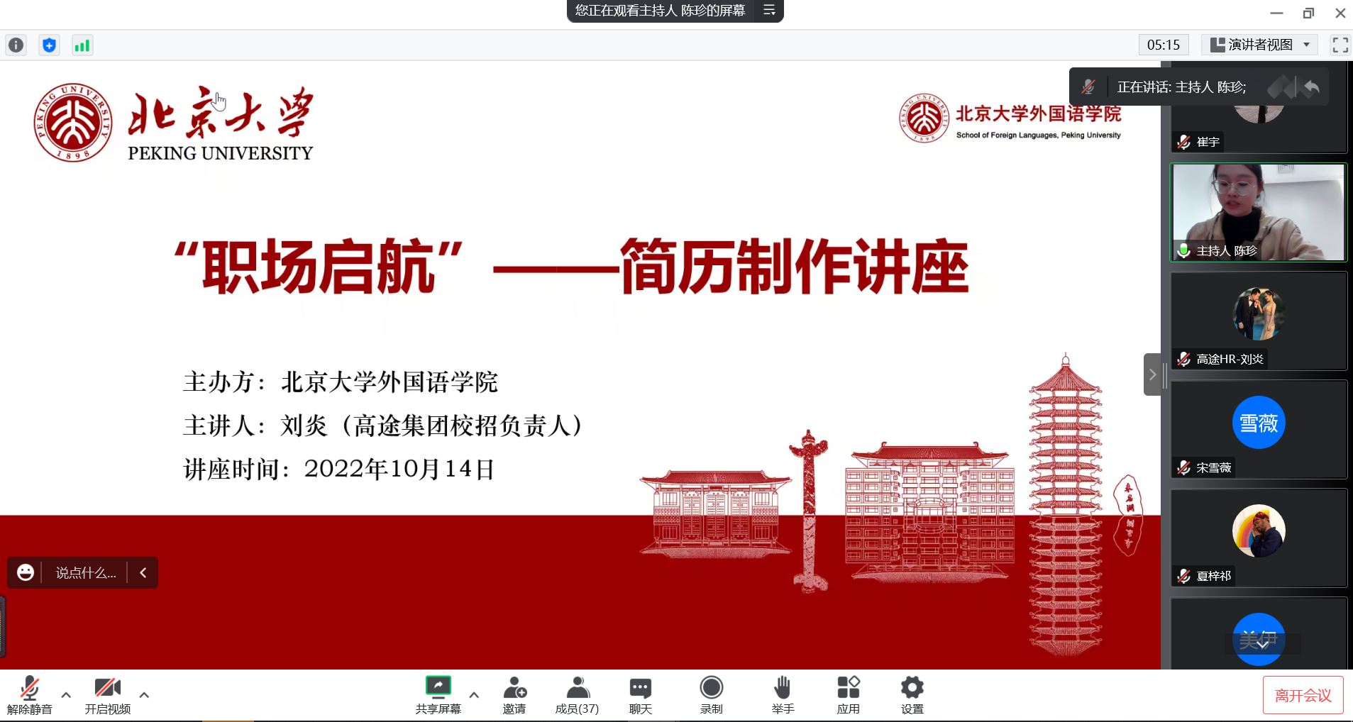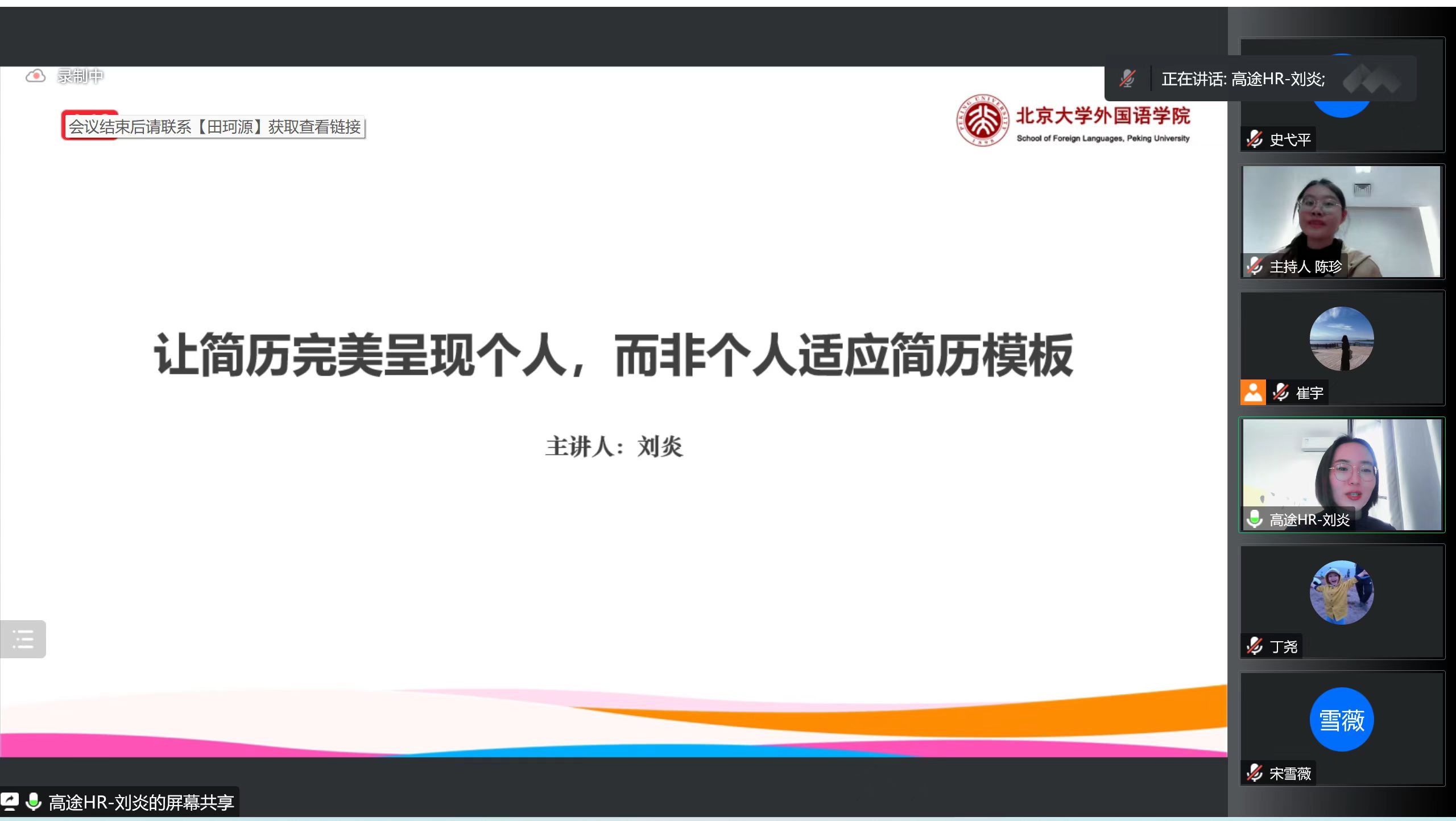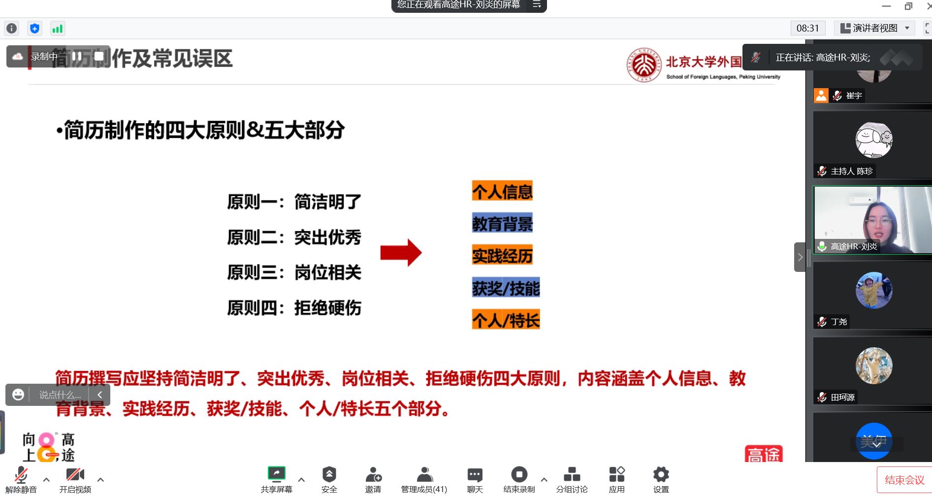 简历是求职的敲门砖,如何制作简历,突出自己的亮点,是毕业生求职必备的知识。为此,财神在线官网特邀请高途集团高端校招负责人刘炎为求职路上的外院学子带来了简历制作方法和常见误区指导。10月14日下午,云端“职场启航”简历制作讲座活动通过腾讯会议顺利举行,学院党委副书记王恒、辅导员丁尧出席本次活动。