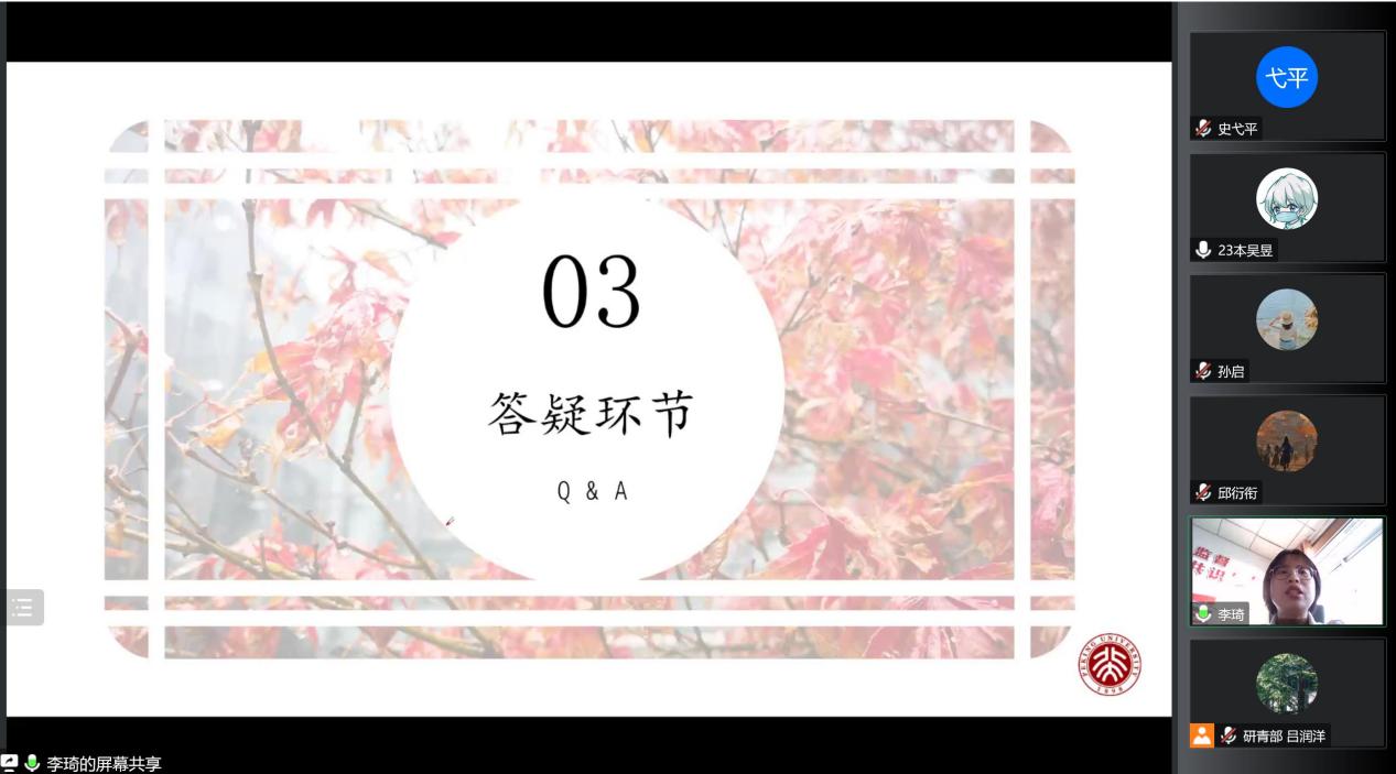李琦校友首先从选调条件、笔试、线下面试、线上面试等方面详细介绍地方选调的总体情况,建议同学们多刷真题、总结规律、跟踪时事。随后李琦又介绍了机关和基层的工作内容,可以概括为省直机关负责政策制定,市直机关负责上传下达,基层单位负责具体落实。谈到在村镇工作的体会,李琦表示:“我第一次切实感到个人的人生方向可以和国家、民族建立起连接,并且可以通过一点一滴的小事来做更多的改变。我们要踏踏实实地去做、去看、去真正为村民谋福利,这是我们从机关到基层的使命,是我们需要努力的方向。”