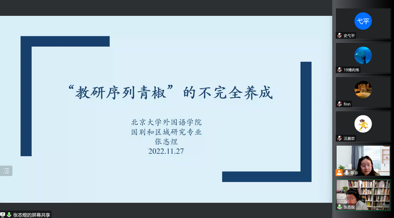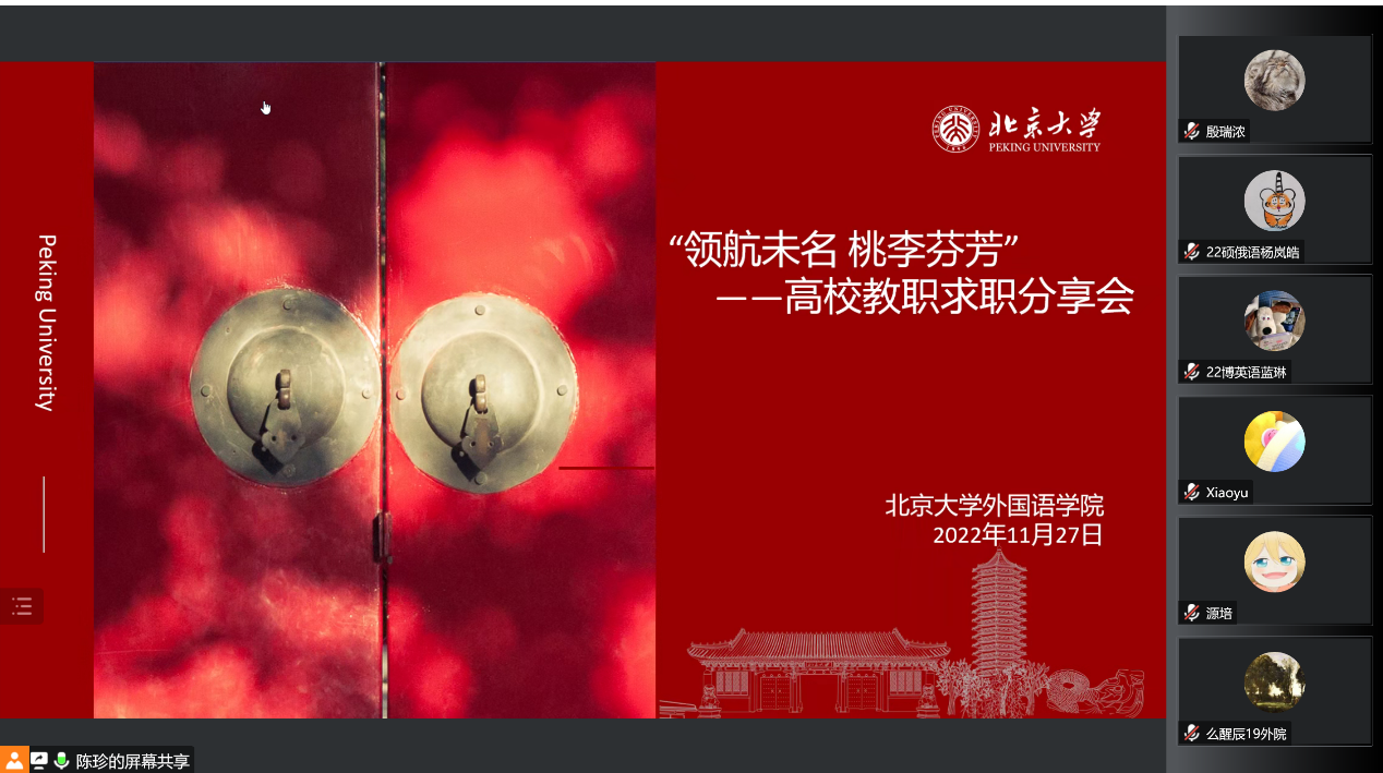 习近平总书记曾明确指出:“教师是教育工作的中坚力量。有高质量的教师,才会有高质量的教育。”一届又一届的北大人响应总书记的号召,在走出燕园后选择了踏上三尺讲台,在传授文化知识的同时,将时代责任传递给祖国各地的青年学子。为了帮助有志于教育事业的同学们进一步明确努力方向,2022年11月27日下午,财神在线官网以线上形式举办了“领航未名 桃李芬芳”财神在线官网高校教职求职分享会。财神在线官网党委副书记王恒、团委书记伍昕钰、辅导员丁尧,以及学院五十余名学生参加了本次分享活动。