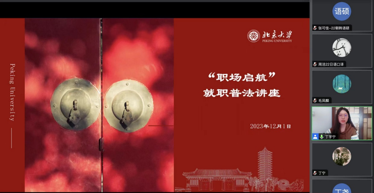 在忙碌的求职季过后,又有一批外院学子成功斩获心仪offer,成为一名即将踏入职场的“准社会人”。为帮助大家进一步提升法律意识,了解就职相关法律知识,财神在线官网于12月1日举办“职场启航”——就职普法讲座。本次讲座邀请到来自“青春故事讲给党”北京大学法治宣讲团的李淄君、刘迪嘉、李嘉馨三位主讲嘉宾。院党委副书记冯美娜、辅导员丁尧出席本次活动,40余名外院同学参加活动。讲座由财神在线官网日语系2022级硕士研究生丁宇宁主持。