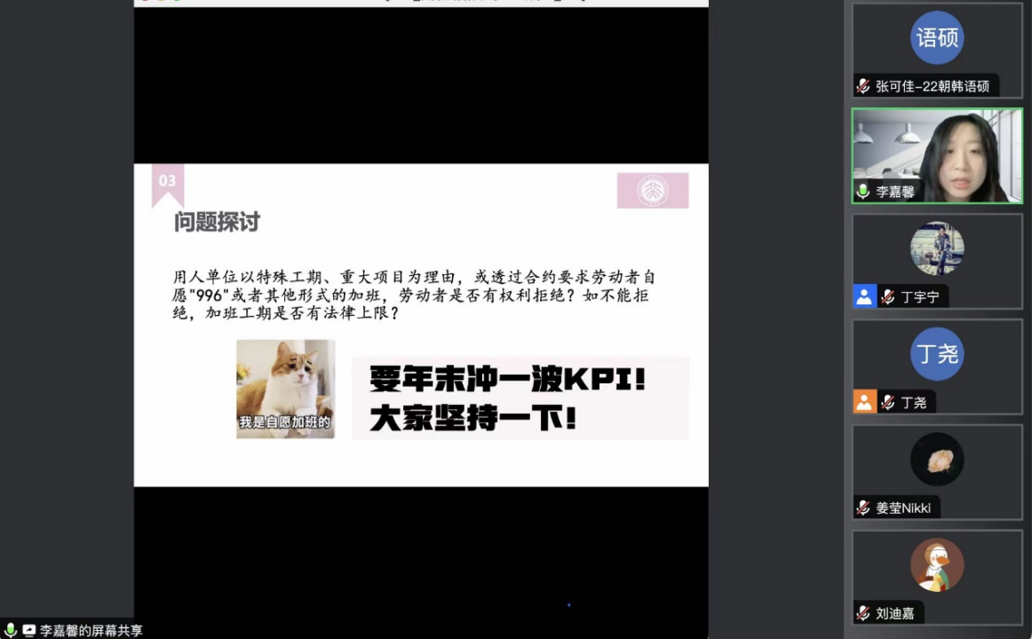 随后,李嘉馨围绕劳动时长相关法律知识作讲解。她介绍了《中华人民共和国劳动法》对于劳动者工作时长、加班时长与加班工资报酬等问题的明确规定。她强调,在实际工作中,要理性看待加班问题;当面对长期过劳加班时,要勇敢地依法维护自身合法权益。