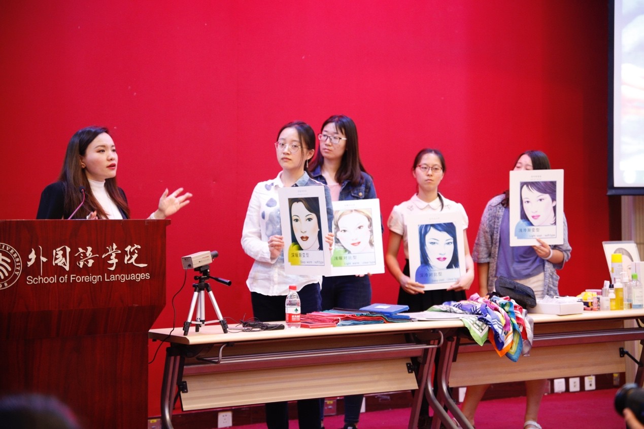 嘉宾讲师结合多年实践经验,为同学们带来了详尽讲解。她强调,无论妆容还是穿搭,切忌盲目模仿跟风,而要找到适合自己的色彩和风格,最重要的是认识自我,了解自我。讲师从色相、纯度、明度三个维度阐释人体颜色与色彩搭配的关系,并用九张脸谱图示及四种妆容模板讲解如何根据自身特点选择适合自己的色彩。在此基础上,嘉宾讲师现身说法,以自己的面部作为模板,现场为同学们示范腮红、眼线、卧蚕等具体妆饰方法。现场体验环节,同学们抽取了护肤品、化妆品等奖品,并有部分同学以志愿者模特身份尝试化妆体验。