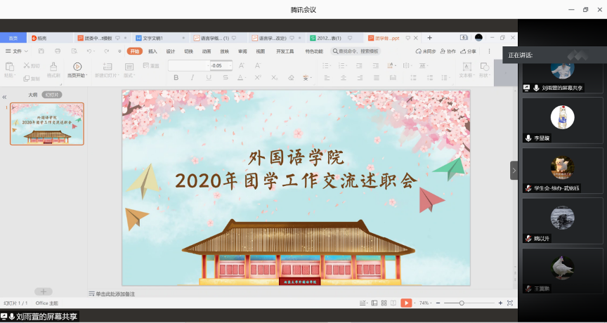 接着,学生会的学生发展部、国际交流部、生活权益部、综合办公室、宣传部、体育部、学术实践部、文艺部、外联部轮流进行述职,对新生物资团购、国庆八天乐、新生舞会筹备、爱国卫生运动系列活动、“一二·九”师生歌会、新年晚会筹备、新生杯、秋季运动会、师生趣味运动会、班级档案、丝路诗语重启、外院十佳歌手比赛、外院文化节、干训讲座、第四期圆桌骑士讨论会、留学推送、各类测评、院衫征集等活动进行了详细的汇报。