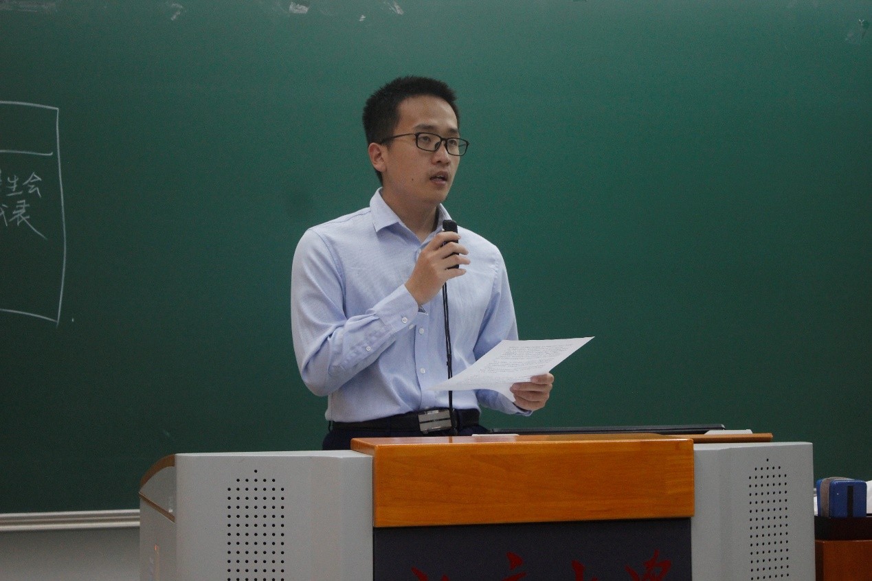 党委副书记王恒首先致辞,他向会议的顺利召开表示祝贺,向第十八届学生会执委会和常务代表委员的辛勤工作表示感谢,对过去一年中全体师生对学院学生工作的监督与配合表示感谢,充分肯定了学生代表们“自我教育、自我服务、自我管理、自我监督”的自主意识。随后他总结了学院学生会和常代表在过去一年中取得的成果,高度肯定了学生工作的突出成绩。对于本次大会的召开,他希望参会人员能进一步明确学生会和常代会的自身定位,更好地发挥出积极的作用,牢记自身代表性,充分发挥桥梁和纽带作用,在维护同学权益、繁荣校园文化等方面积极付出,为同学发声,做好师生交流的纽带。他援引习近平主席对青年提出的六点要求:树立远大理想、热爱伟大祖国、担当时代责任、勇于砥砺奋斗、练就过硬本领、锤炼品德修为,希望同学们做好新时代青年,成为合格的社会主义事业建设者与接班人。最后,他强调了本次大会的纪律,要求本次选举公开透明,程序正当,并对下一届学生会和常代表提出希望,勉励他们接好学生工作的接力棒,发扬外院人的优良传统,在服务和奉献中成长成才。