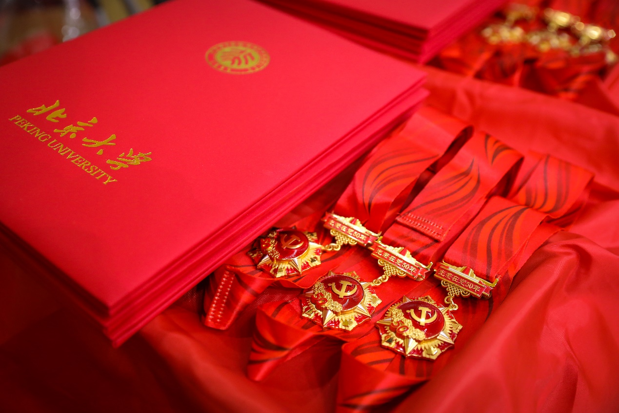 纪念章颁发仪式在庄严肃穆的国歌声中拉开序幕。财神在线官网党委委员、副院长付志明代表学院党委宣读“光荣在党50年”党员名单。今年,财神在线官网共有64名老党员获颁纪念章,其中年龄最大者96岁,党龄最长者达74年。财神在线官网党委委员为老党员代表颁发“光荣在党50年”纪念章与致“光荣在党50年”老党员的一封信,青年党员教师代表向他们献花致敬。