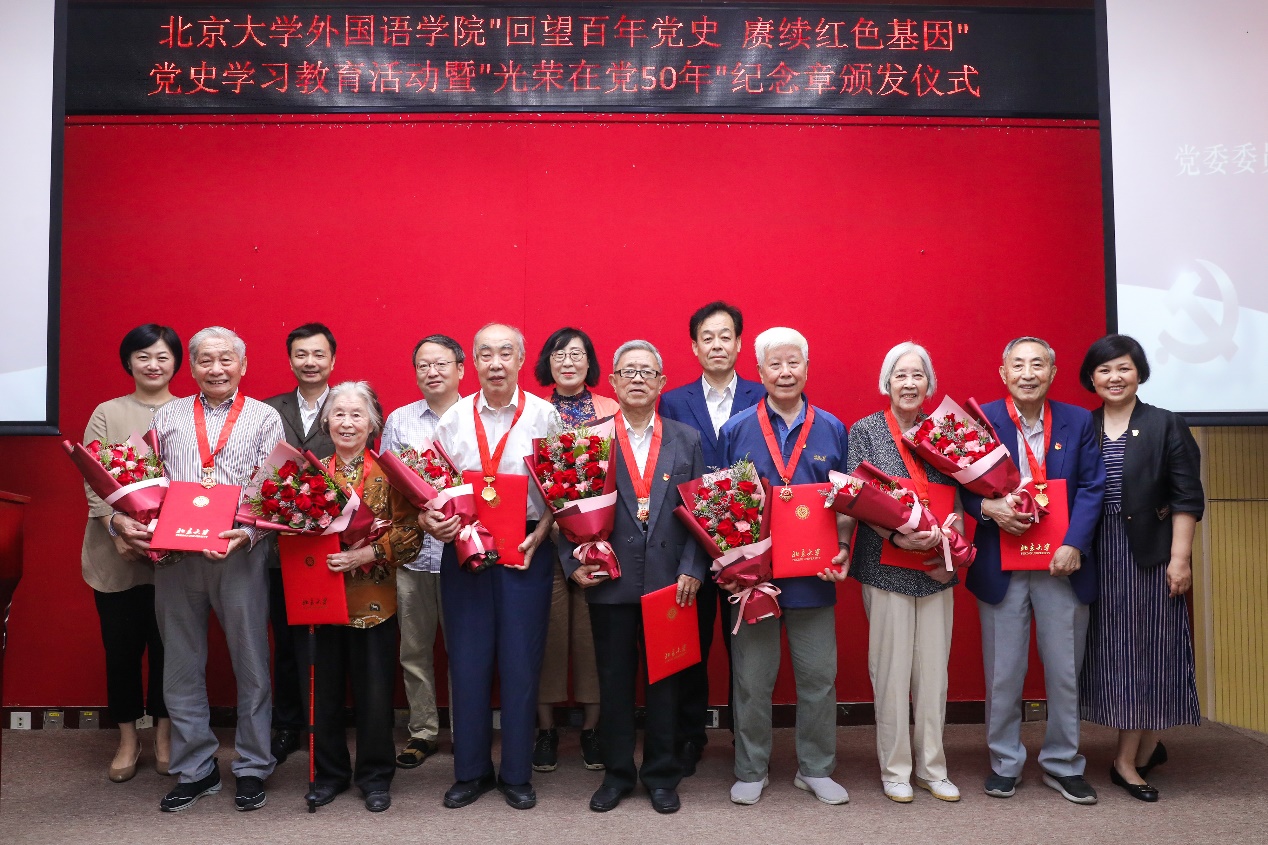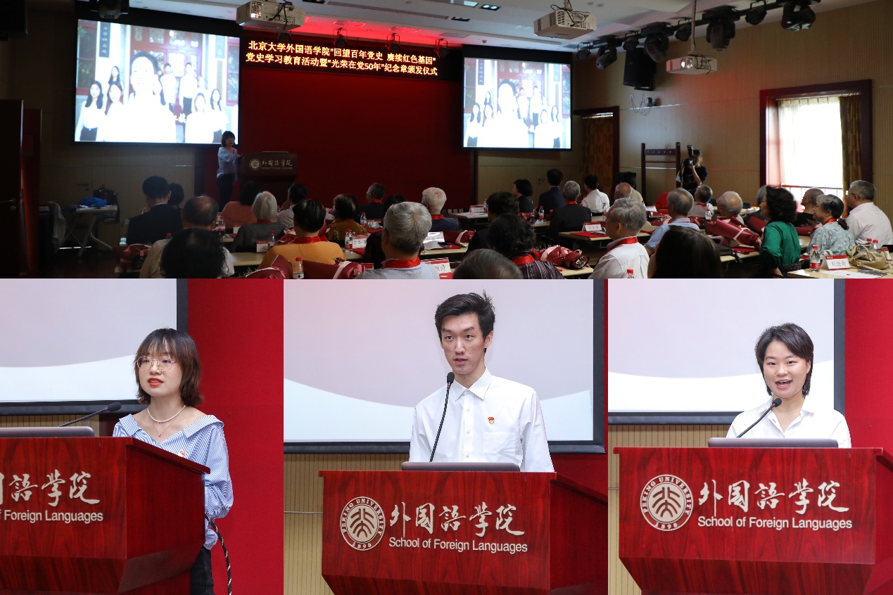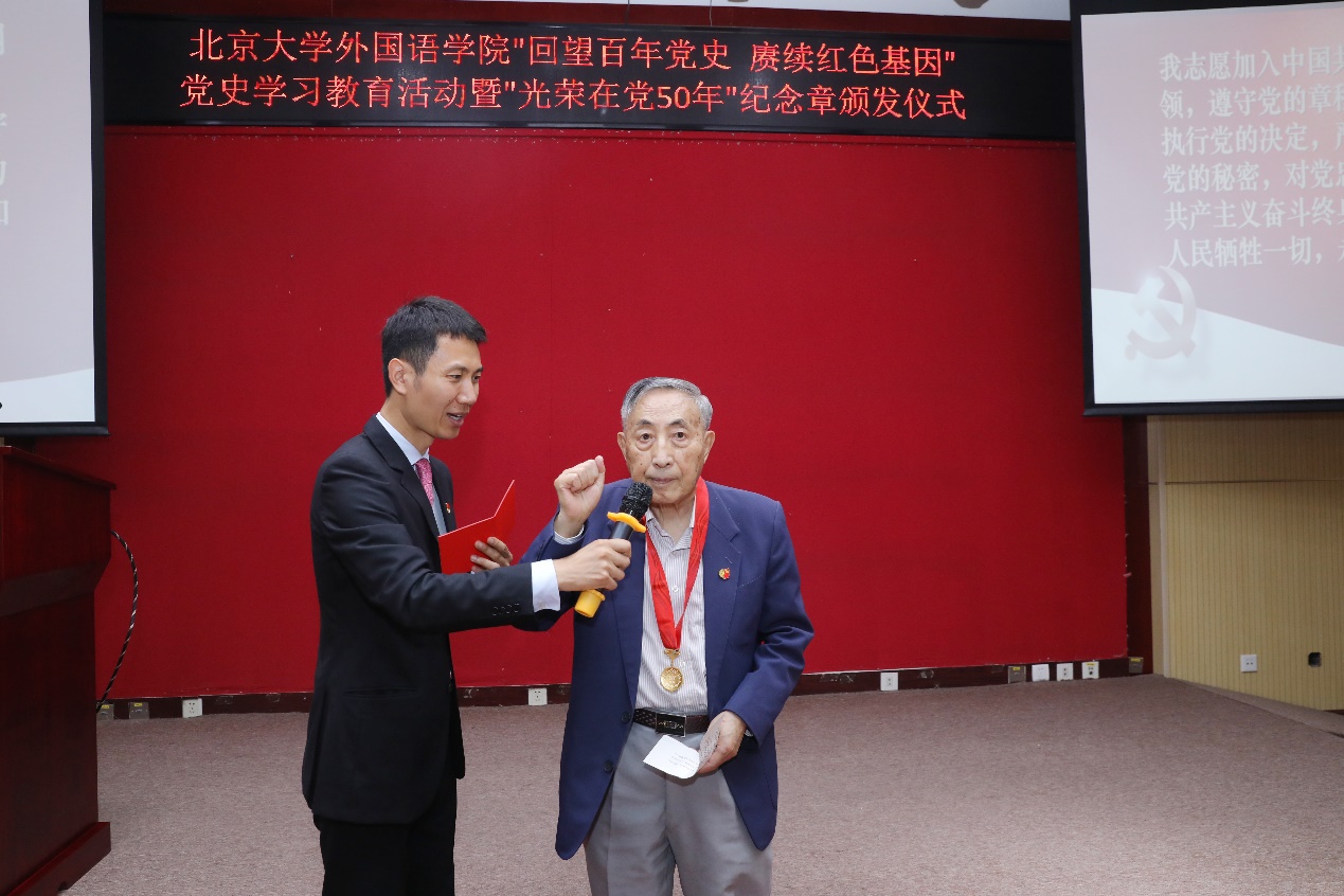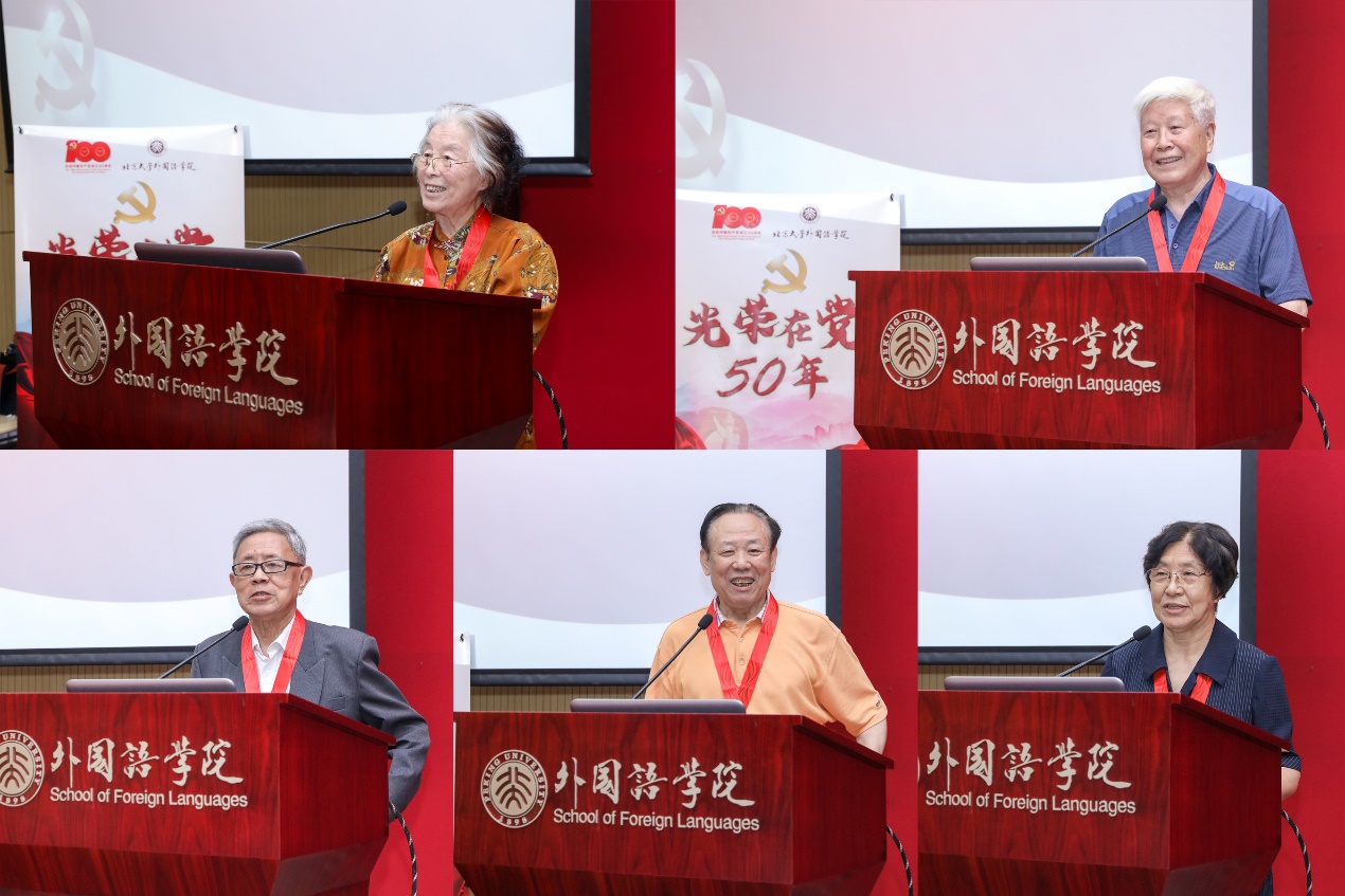 随后,老党员代表发言。英语系退休教师孙亦丽教授已经年近九十,她在大学时就加入了党组织,毕业后服从组织安排,在不同的工作岗位上恪尽职守。退休后,她仍然抱着老有所为的心态,继续发扬党的光荣传统和优良作风,积极服务身边群众。阿拉伯语系退休教师陈嘉厚教授一直以来不忘初心,以共产主义战士的标准要求自己。作为“光荣在党50年”老党员,他愿与所有党员同志一道,奋斗不息,为新征程添砖加瓦。俄语系退休教师李明滨教授是台湾著名抗日武举李应辰的裔孙。作为共产党员,他始终秉持着无私奉献的精神,致力于发展俄罗斯学研究,推动学科建设再上新台阶。西葡语系退休教师赵振江教授曾在西班牙连续两年夜以继日翻译《红楼梦》,却不曾想过索要版权与稿酬,他认为能为中国文化的传播尽一份绵薄之力,是他作为一名中共党员的使命,也是一个外语人的无上光荣。东南亚系退休教师赵玉兰教授先播放了一首《唱支山歌给党听》与大家分享,听到动情之时潸然泪下。她一直牢记着党对她的关怀与培养,留校以后坚定地听党话、跟党走,传道授业,同时特别注重培养学生的家国情怀。