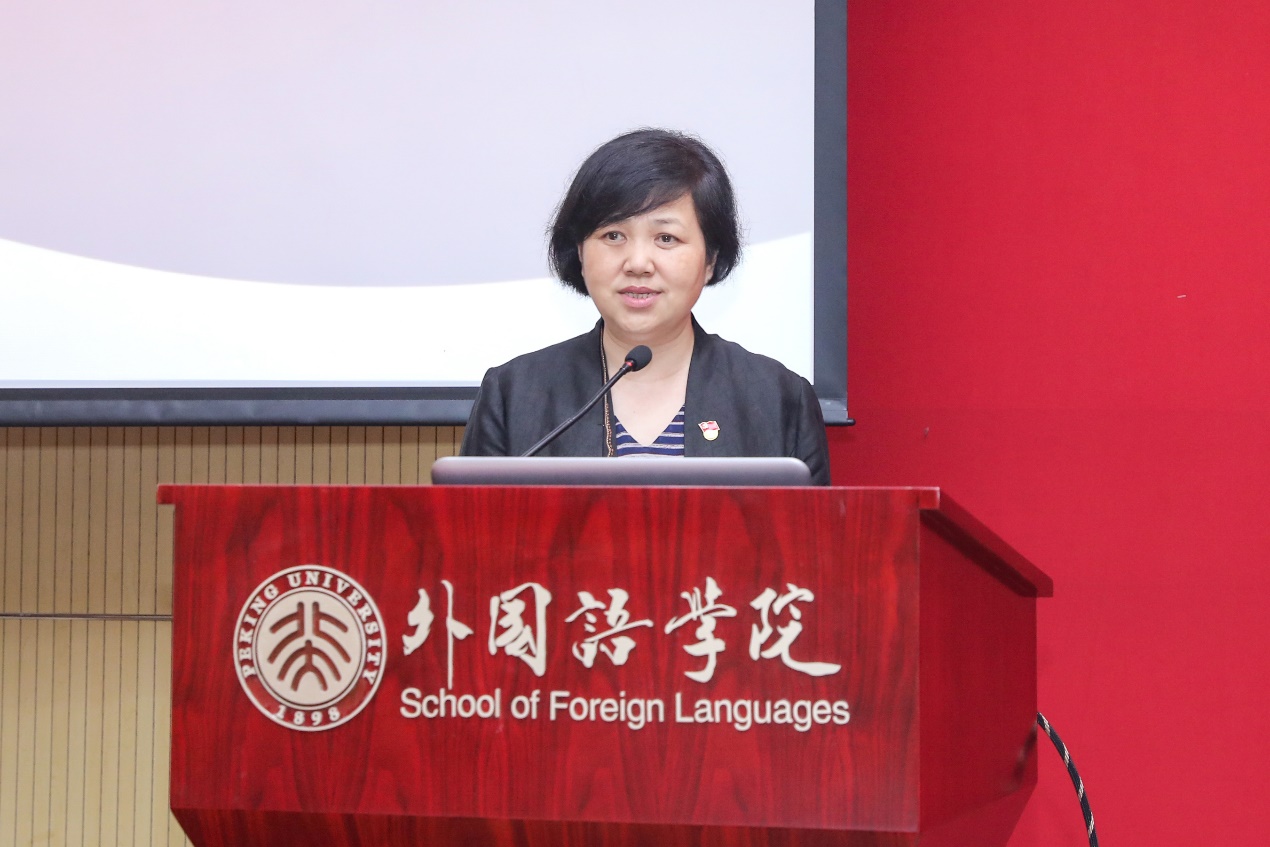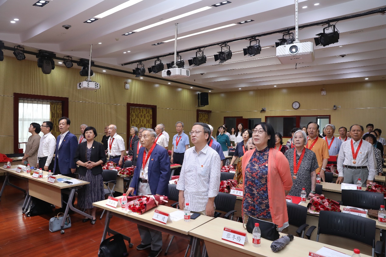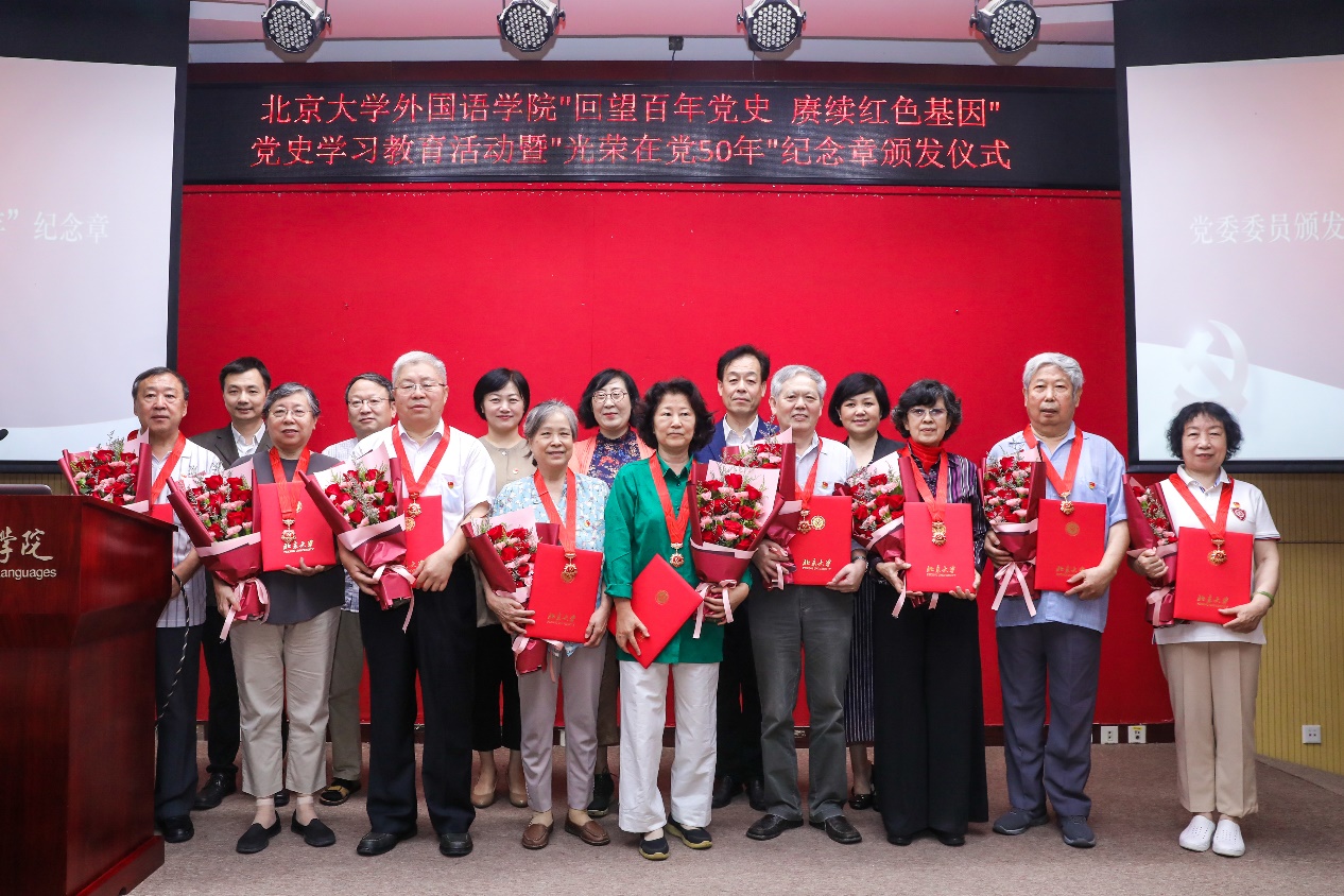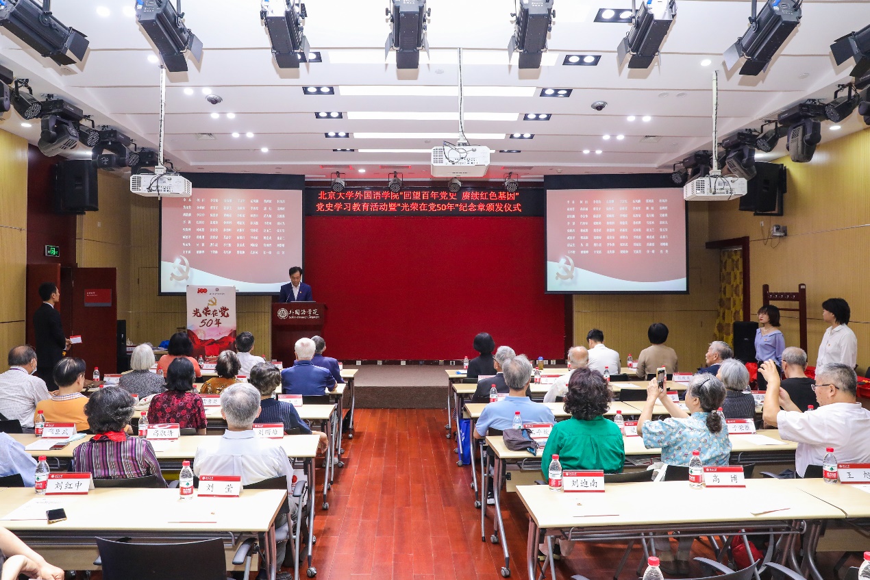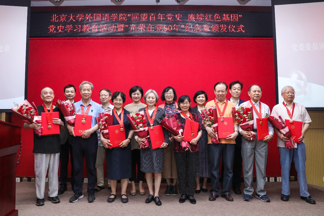 随后,老党员代表发言。英语系退休教师孙亦丽教授已经年近九十,她在大学时就加入了党组织,毕业后服从组织安排,在不同的工作岗位上恪尽职守。退休后,她仍然抱着老有所为的心态,继续发扬党的光荣传统和优良作风,积极服务身边群众。阿拉伯语系退休教师陈嘉厚教授一直以来不忘初心,以共产主义战士的标准要求自己。作为“光荣在党50年”老党员,他愿与所有党员同志一道,奋斗不息,为新征程添砖加瓦。俄语系退休教师李明滨教授是台湾著名抗日武举李应辰的裔孙。作为共产党员,他始终秉持着无私奉献的精神,致力于发展俄罗斯学研究,推动学科建设再上新台阶。西葡语系退休教师赵振江教授曾在西班牙连续两年夜以继日翻译《红楼梦》,却不曾想过索要版权与稿酬,他认为能为中国文化的传播尽一份绵薄之力,是他作为一名中共党员的使命,也是一个外语人的无上光荣。东南亚系退休教师赵玉兰教授先播放了一首《唱支山歌给党听》与大家分享,听到动情之时潸然泪下。她一直牢记着党对她的关怀与培养,留校以后坚定地听党话、跟党走,传道授业,同时特别注重培养学生的家国情怀。