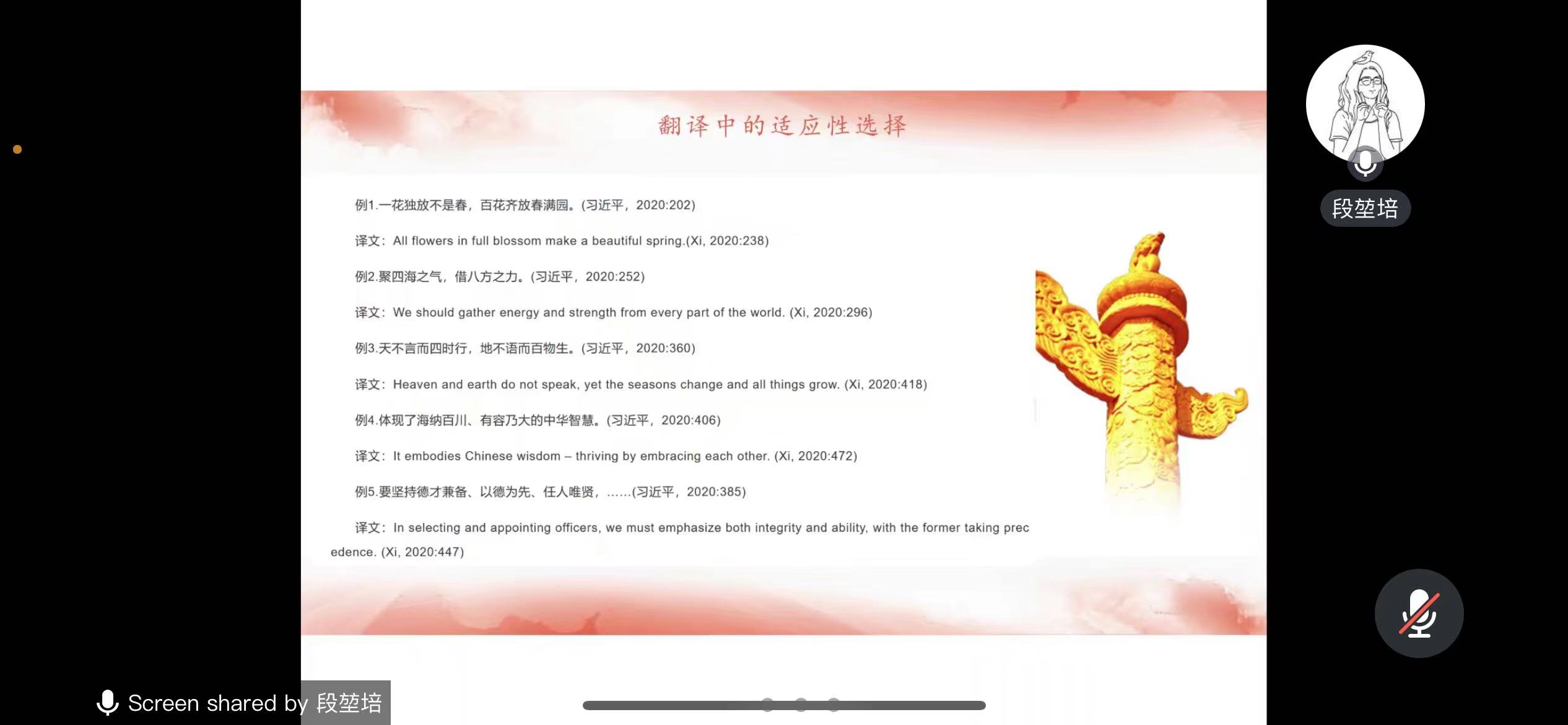 5月13日的法语班读书会主题为“浅谈政治文献翻译的准确性”。会议在同学们的交流互动中开始,随后介绍了二十大中文及法语文本,列举了翻译中常见的错误,最后结合外文出版社法文专家的讲座指导,以例证结合的方式向同学们讲解准确翻译的重要性。2021级博士生、领读者赵婉雪讲解了翻译重要文件中的专有名词时容易出现的错误,和中国传统文化相关词汇的翻译,并传授了能准确表达中国理念的翻译方式。在5月21日的读书会上,2022级博士生、领读者孟瑶带领同学们学习了《习近平谈治国理政》(第三卷)中的多篇讲话,主要包括习近平主席引用的古诗词段落的法文翻译、所选段落中的时政热词,并探讨了古诗词翻译的技法策略。通过学习,同学们对我国科技、文化、生态文明、制度建设的重要理念更加了解,在通过古诗词翻译感受到中文和法语的语法美感的同时,增强了文化自信。